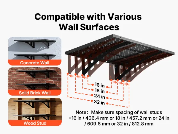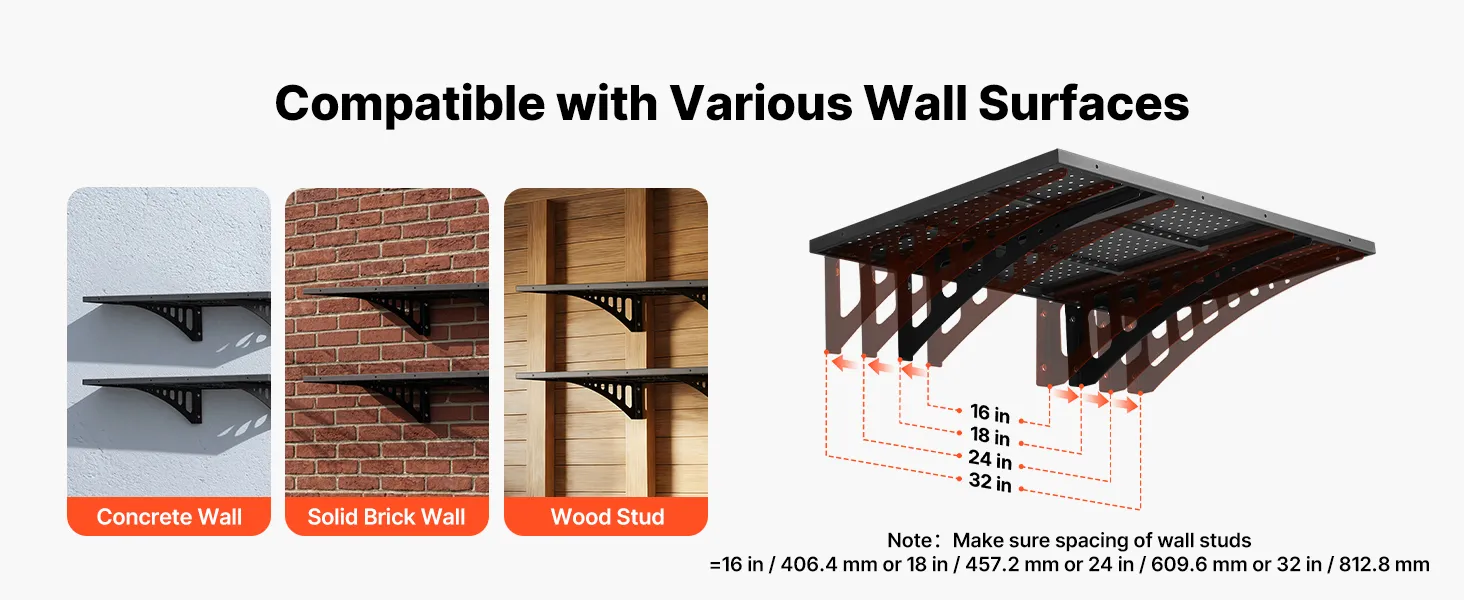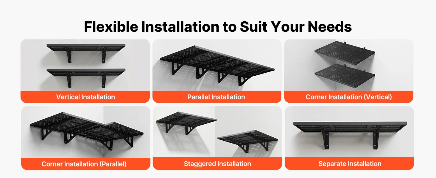 Pasuje do wielu typów ścian: Ta montowana na ścianie półka garażowa jest kompatybilna z rozstawem słupków 406,4 mm (16 cali), 457,2 mm (18 cali), 609,6 mm (24 cale) lub 812,8 mm (32 cale). Jej konstrukcja umożliwia montaż na ścianach z profili betonowych, ceglanych lub drewnianych, zapewniając elastyczne dopasowanie do różnych układów pomieszczeń.
