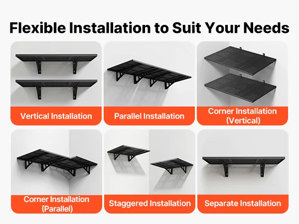 Te półki ścienne można dopasować do różnych układów pomieszczeń dzięki regulowanemu rozstawowi wsporników wynoszącemu 406,4 mm (16 cali), 457,2 mm (18 cali), 609,6 mm (24 cale) lub 812,8 mm (32 cale). Można je bezpiecznie zamontować na ścianach betonowych, ścianach z cegły pełnej lub ścianach z drewnianymi słupkami.