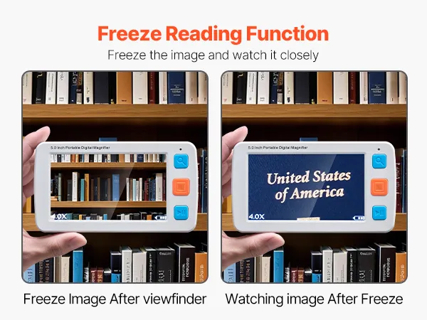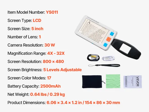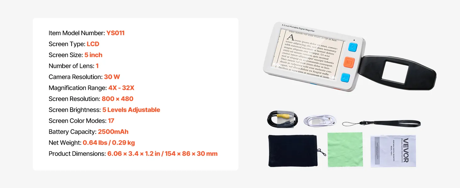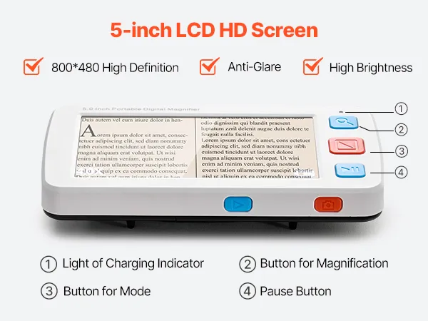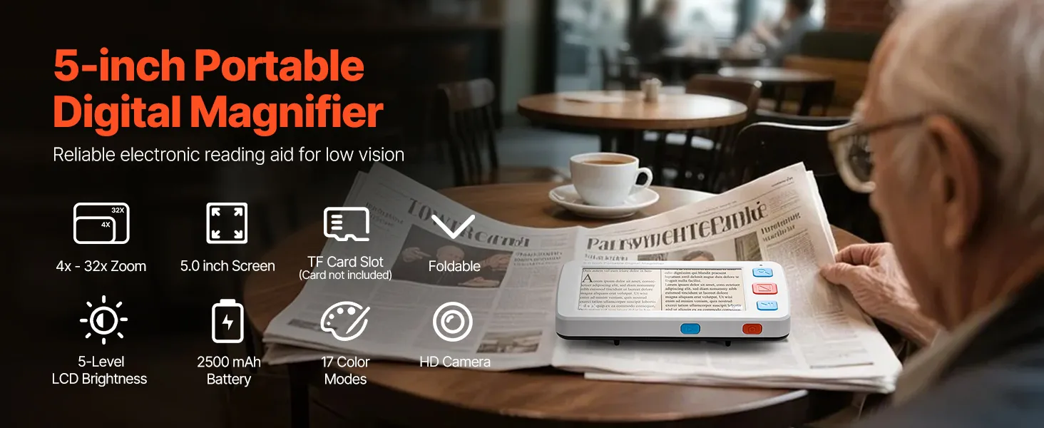 Wyposażona w 5,0-calowy ekran HD LCD, powiększenie o wysokiej rozdzielczości od 4x do 32x, 17 trybów kolorów, 5-poziomową jasność ekranu LCD, wyjście AV i akumulator o pojemności 2500 mAh, ta przenośna cyfrowa lupa zapewnia kompleksową pomoc wizualną osobom niedowidzącym podczas czytania i oglądania obrazów.