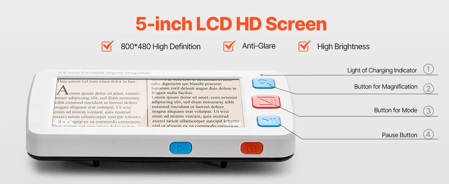 Powiększenie HD: Ta cyfrowa lupa ręczna, wyposażona w 5-calowy ekran LCD (800 x 480), oferuje powiększenie o wysokiej rozdzielczości od 4x do 32x. Wystarczy położyć ją na książkach lub gazetach, aby uzyskać optymalną ostrość.
