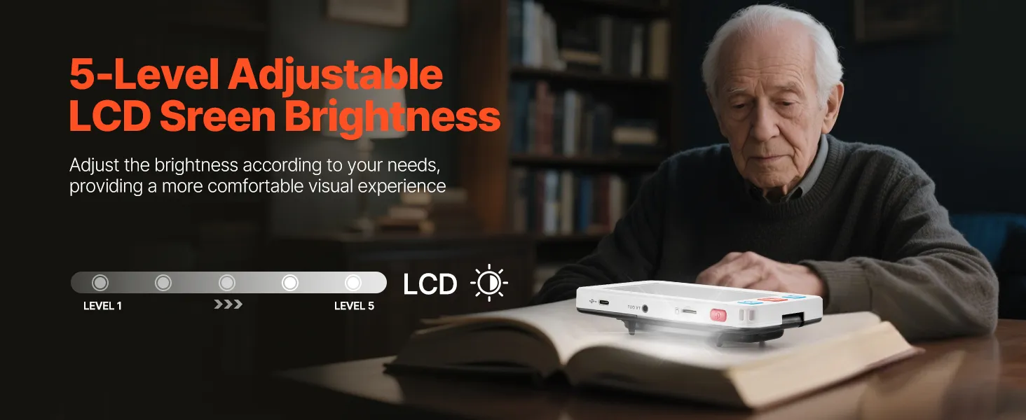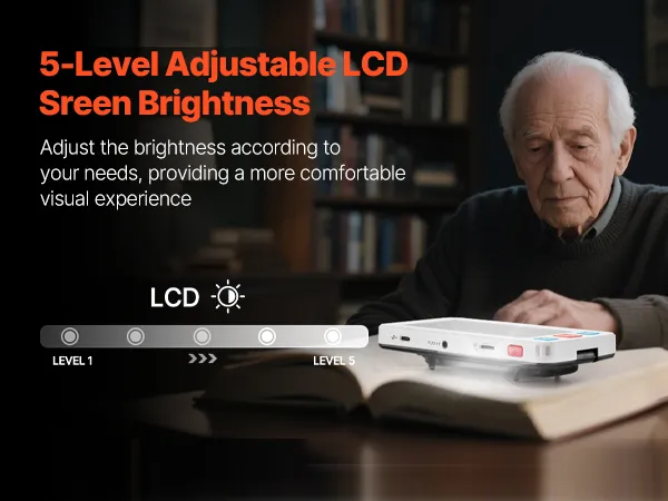 Dzięki wyświetlaczowi LCD z 5 poziomami jasności, ta cyfrowa lupa ręczna pozwala dostosować jasność do indywidualnych potrzeb. Zapewnia to większy komfort oglądania, zmniejsza zmęczenie oczu i pomaga chronić wzrok.