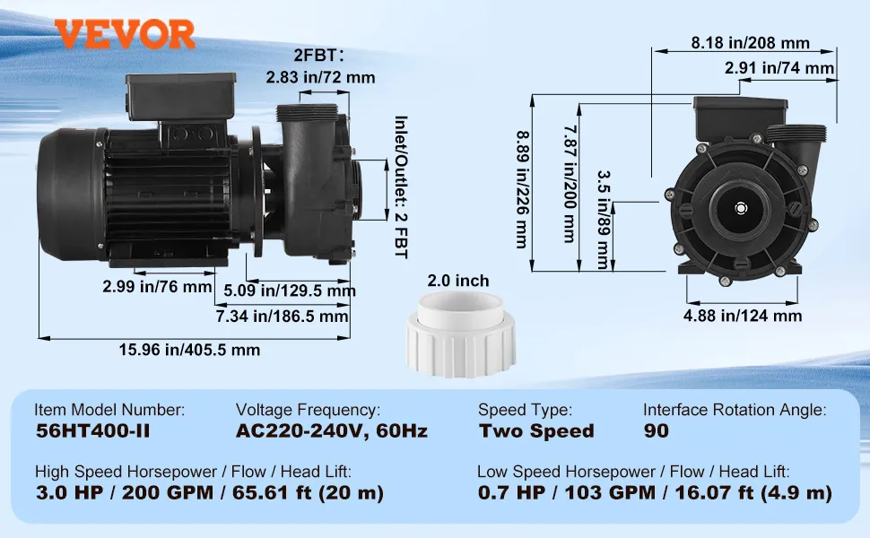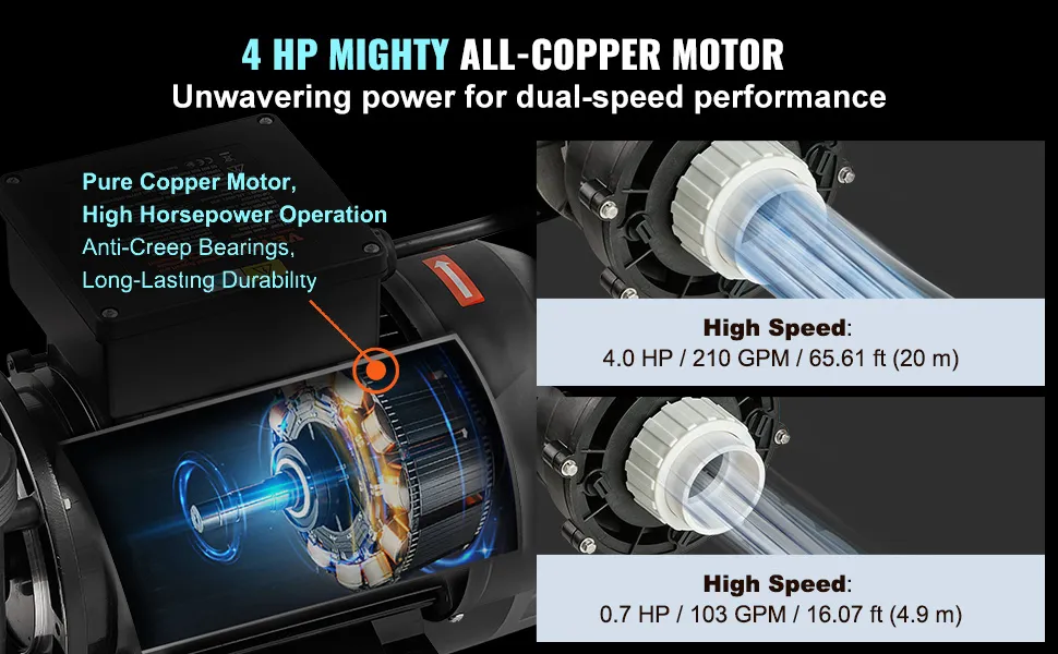 Pompa VEVOR SPA o dwóch prędkościach, 56-ramienna pompa do jacuzzi o dwóch prędkościach, 1900 W/43 m³/h/18 m, wysoka prędkość lub 450 W/21,5 m³/h/4,4 m, złącze 2-calowe, obrotowy interfejs 90° do jacuzzi, certyfikat TUV
