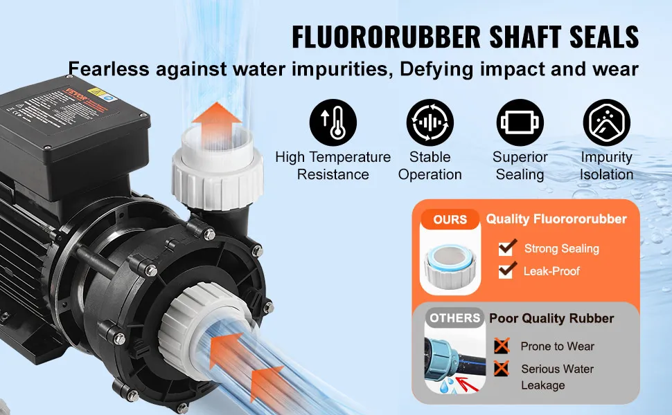 Szczelność pompowania jest kluczowa dla wydajności pompy do jacuzzi. Dlatego stosujemy wyłącznie uszczelnienia wału z fluorokauczuku, które zapewniają dobrą odporność na wysokie temperatury, korozję, olej i starzenie.