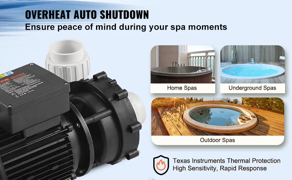Pompa posiada dwubiegową konstrukcję o mocy 1900/450 W, a 5-centymetrowe wloty i wyloty idealnie pasują do istniejących wanien. Silnik z czystej miedzi przeszedł test elektryczny 80 000 cykli i jest wyposażony w łożyska antypoślizgowe, zapewniające płynną pracę.