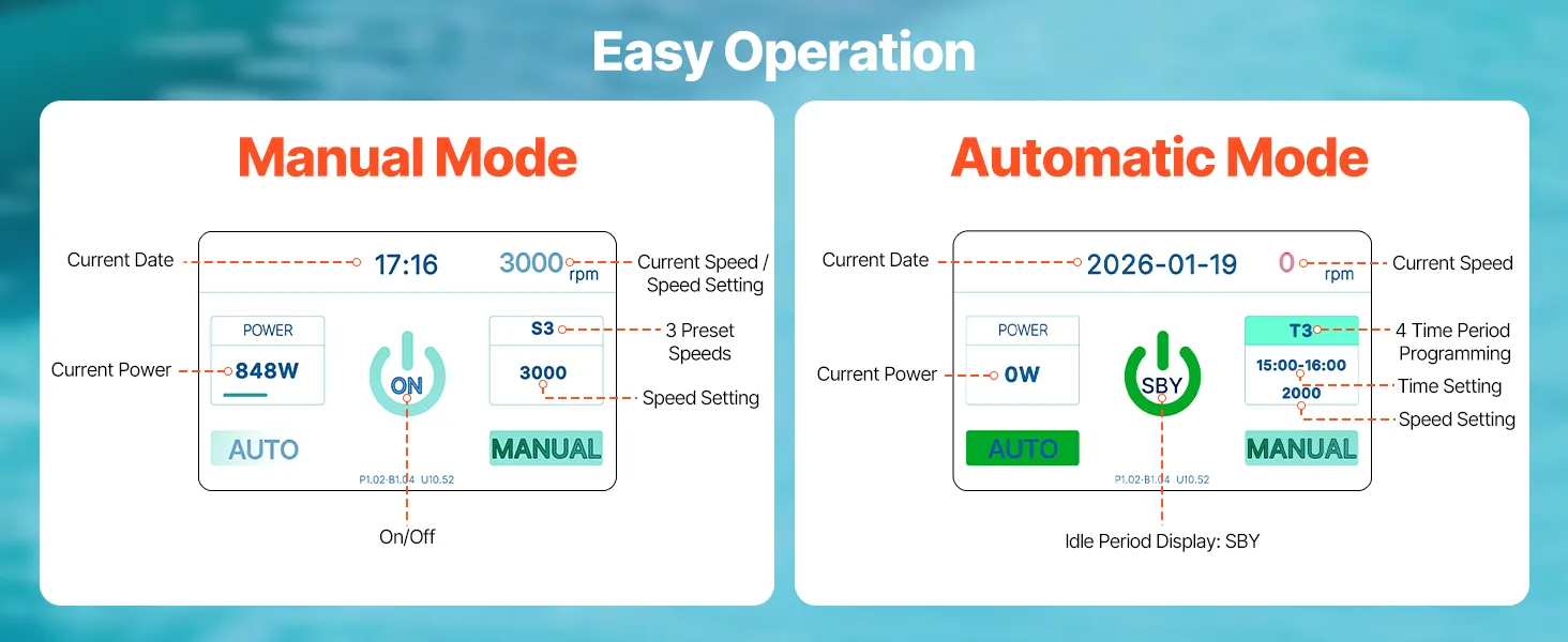 The LCD display on this in / above ground pool pump shows real-time status, while 3 preset modes, one-touch selection, and 24-hour automatic operation make daily use simple and convenient.