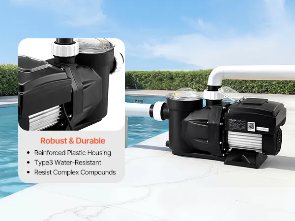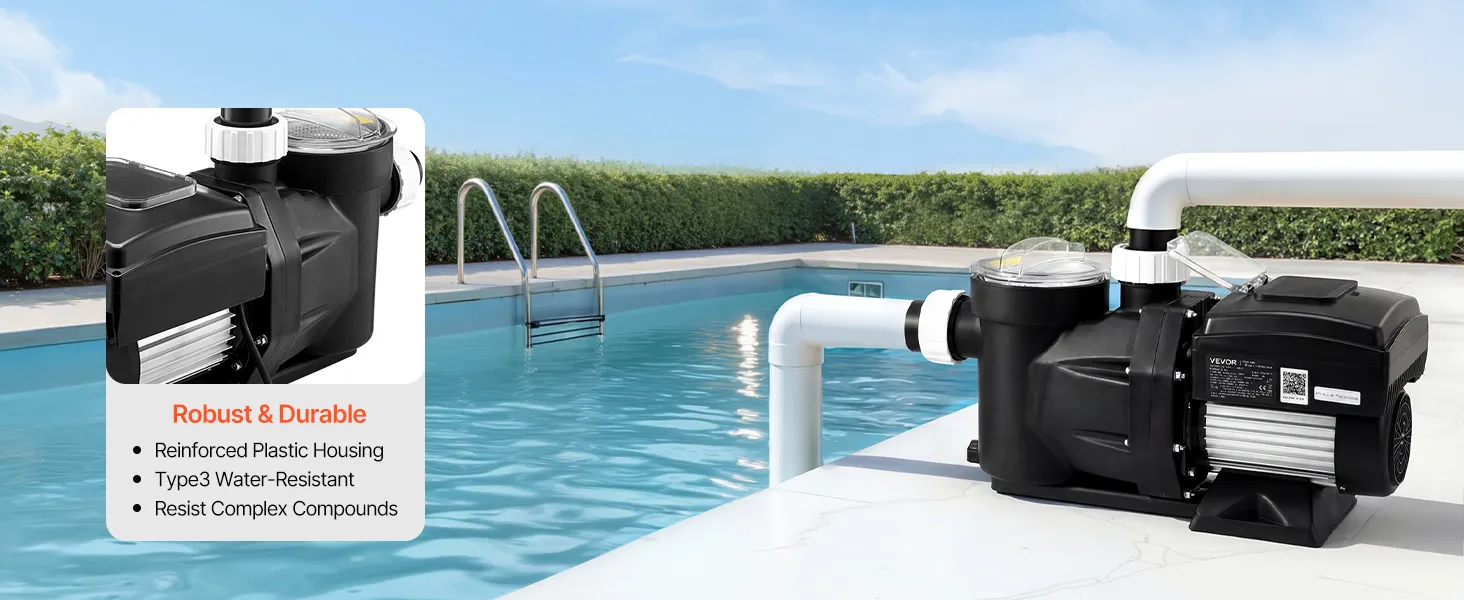 • Premium & Durable Build: Equipped with a permanent magnet motor, this swimming pool pump runs cooler, lasts longer, and saves energy. Its reinforced plastic housing with IPX5 waterproof protection resists harsh pool conditions for long-term reliability