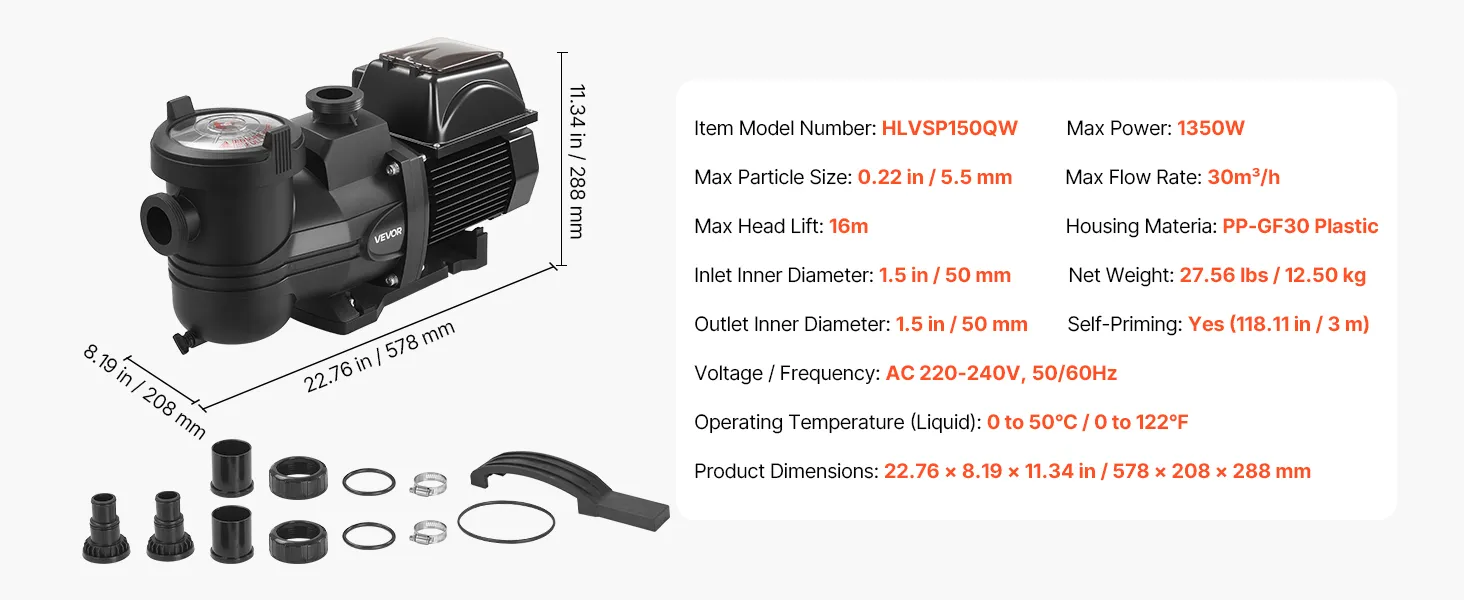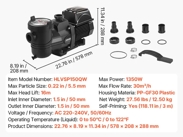 Dzięki maksymalnej mocy wyjściowej 1350 W, maksymalnej wysokości podnoszenia 16 m, maksymalnemu przepływowi 30 000 l/h i zmiennej regulacji prędkości od 1000 do 2900 obr./min, ta pompa basenowa gwarantuje dobrą cyrkulację i niezwykle wydajną filtrację.