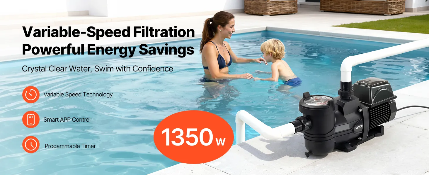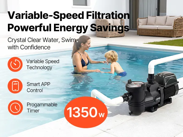 Większa energooszczędność: Ta pompa basenowa o zmiennej prędkości dostosowuje swoją prędkość do rozmiaru basenu i częstotliwości użytkowania, oszczędzając do 89% energii w porównaniu ze standardowymi pompami o stałej prędkości.