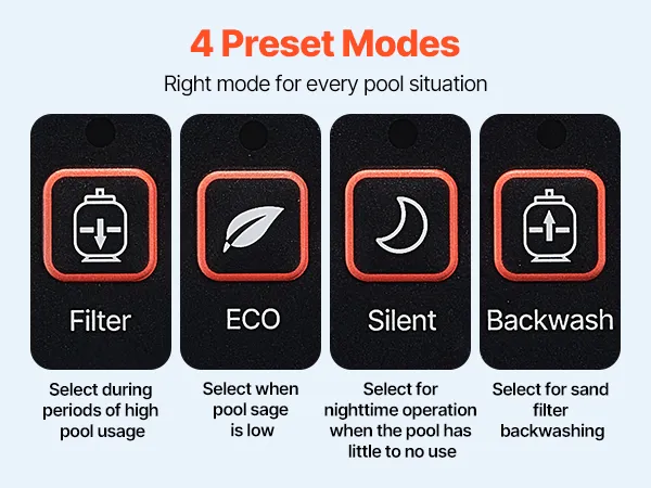 Wysoce wydajna filtracja: Maksymalna moc 1350 W, maksymalna wysokość podnoszenia 16 m, maksymalny przepływ 30 000 l/h, płynna regulacja prędkości od 1000 do 2900 obr./min i 4 wstępnie ustawione tryby sprawiają, że ta wbudowana/naziemna pompa basenowa zapewnia wydajną filtrację i krystalicznie czystą wodę.