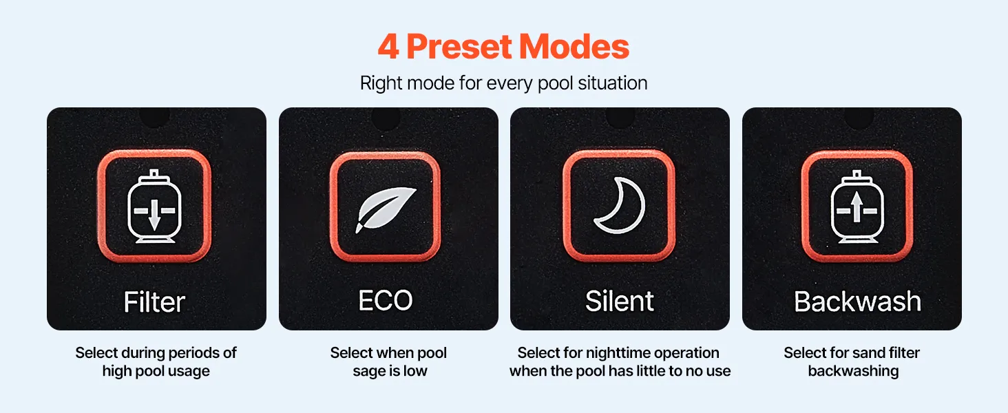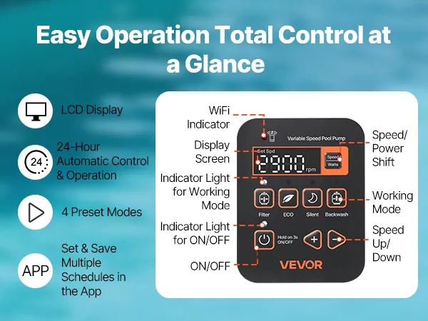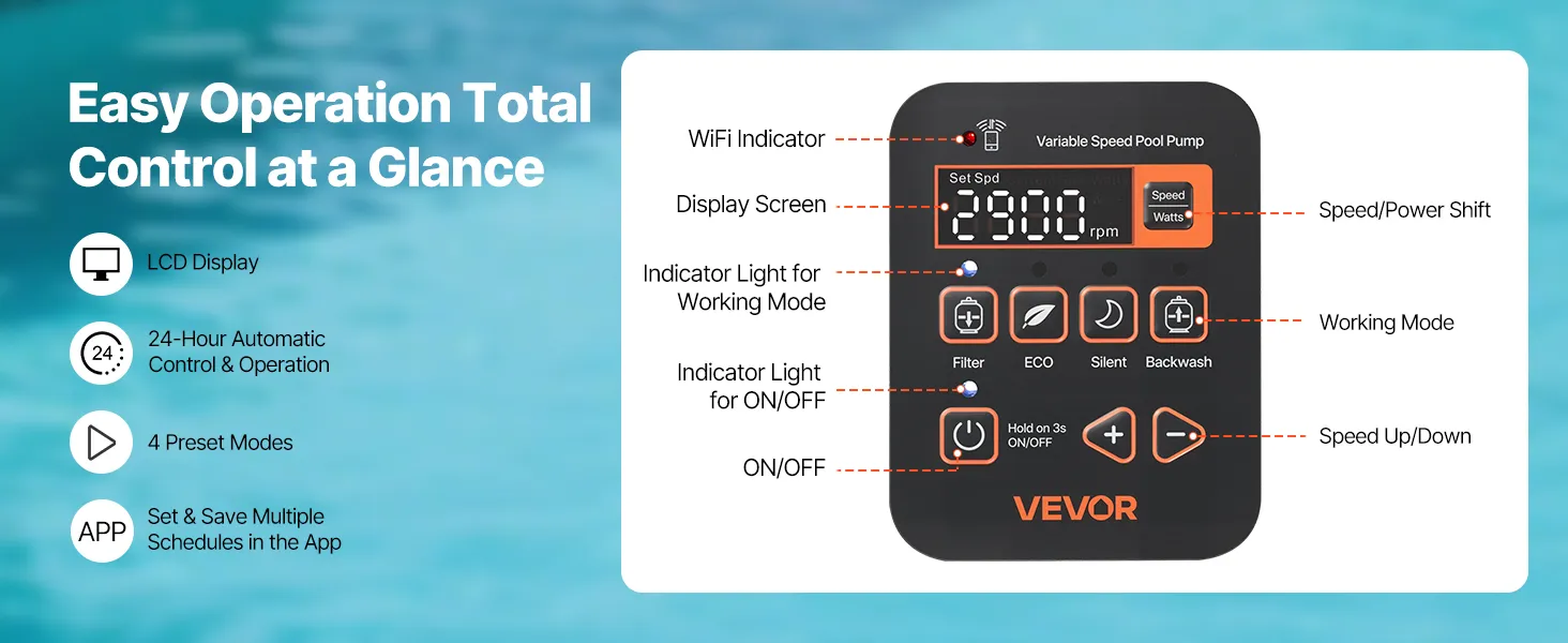 Wyświetlacz LCD tej wbudowanej/naziemnej pompy basenowej pokazuje stan w czasie rzeczywistym, a 4 wstępnie ustawione tryby, wybór jednym przyciskiem i automatyczna praca 24-godzinna sprawiają, że codzienne użytkowanie jest proste i wygodne.