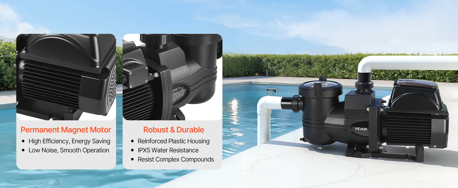 Najwyższa jakość i trwałość: Wyposażona w silnik z magnesami trwałymi, zapewniający płynną i cichą pracę. Ta samozasysająca pompa filtrująca ma wzmocnioną obudowę, jest wodoodporna zgodnie ze standardem IPX5 i zapewnia doskonałą ochronę przed trudnymi warunkami panującymi w basenie.