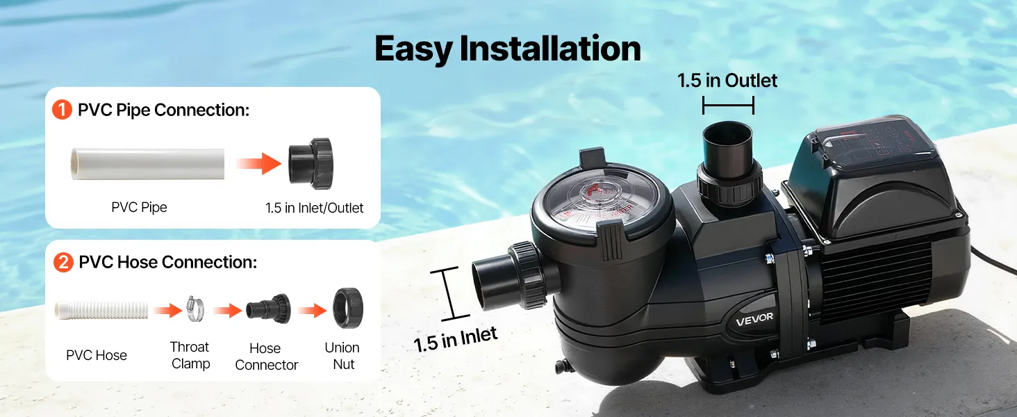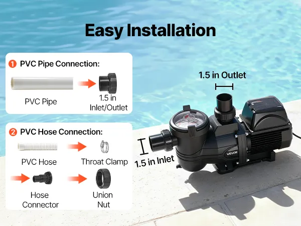 Ta pompa basenowa o zmiennej prędkości obsługuje zarówno rury PCV, jak i elastyczne węże PCV, umożliwiając szybkie i łatwe podłączenie w zaledwie kilku prostych krokach.