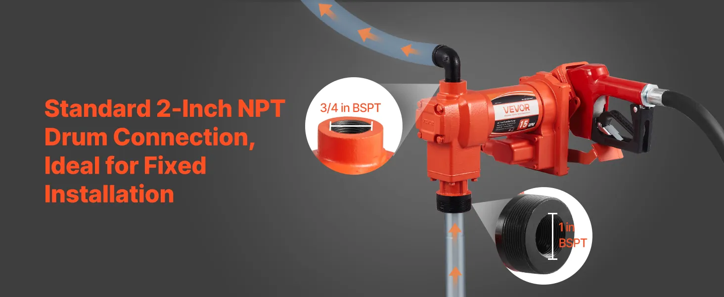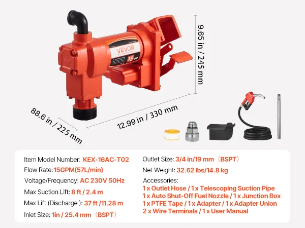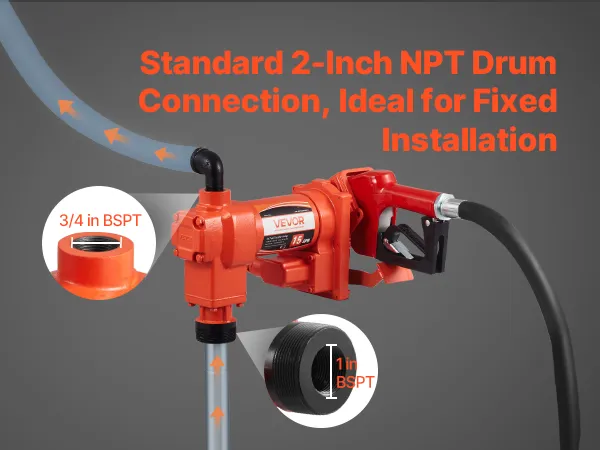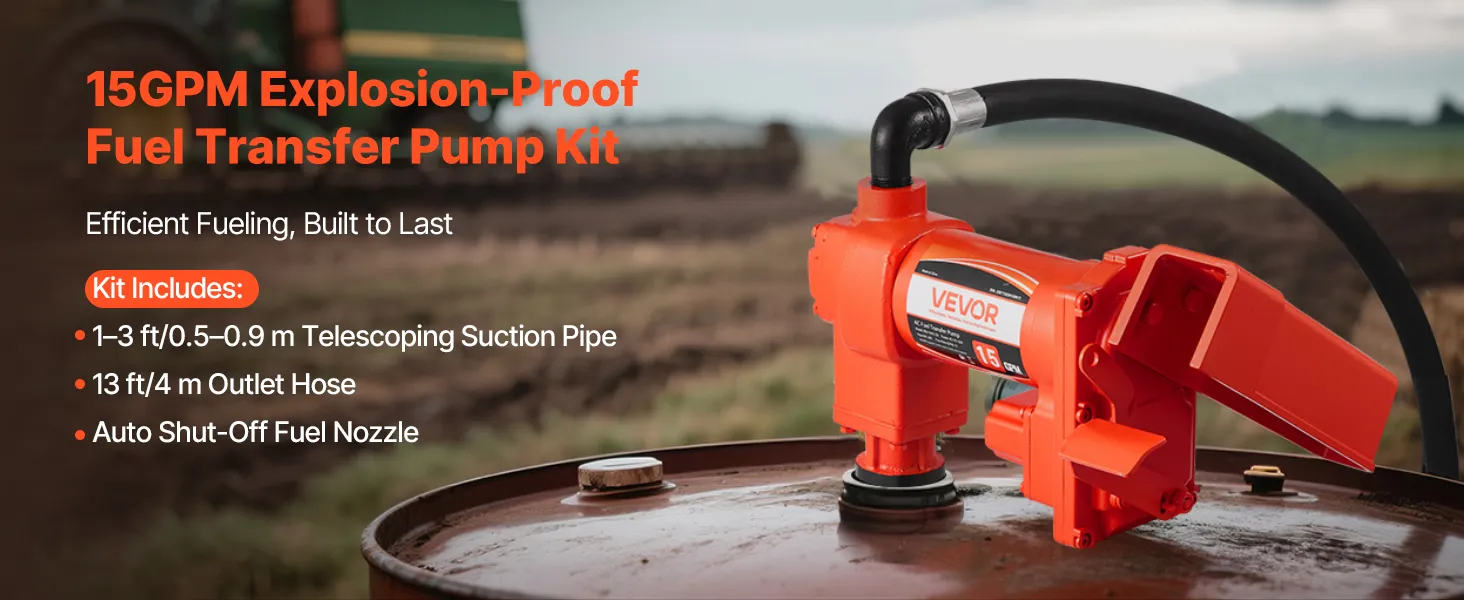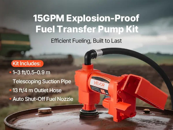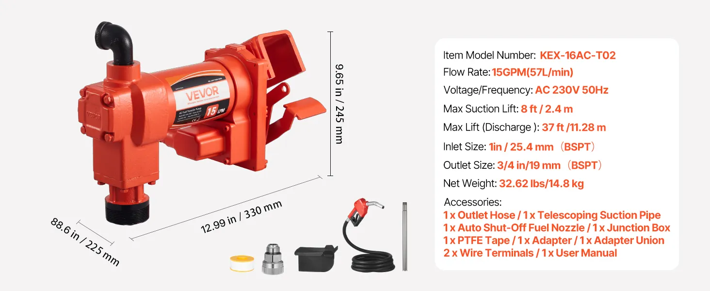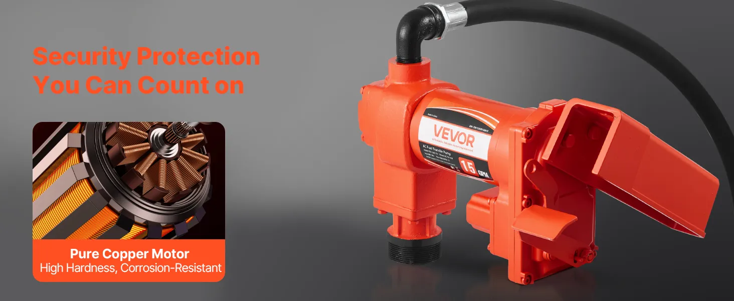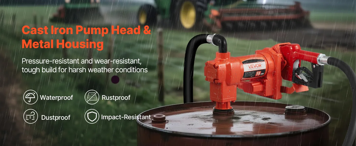 Szybki transfer paliwa z maksymalnym przepływem 57 l/min (15 GPM), maksymalną wysokością ssania 2,4 m (8 stóp) i maksymalną wysokością tłoczenia 11,28 m (37 stóp). Wyposażona w silnik z czystej miedzi, żeliwną głowicę pompy i zintegrowane zabezpieczenie przed przegrzaniem, pompa ta oferuje niezawodną wydajność i bezpieczną pracę z olejem napędowym, naftą i biodieslem.