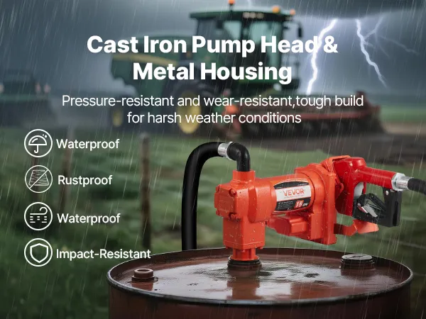 Solidna konstrukcja z żeliwa: Żeliwo zapewnia odporność na wysokie ciśnienie, zużycie i korozję. Ta pompa transferowa na olej napędowy 230 V z wodoodpornym wyłącznikiem zapobiega przedostawaniu się wody na zewnątrz i w wilgotnych warunkach.