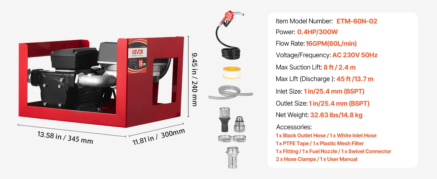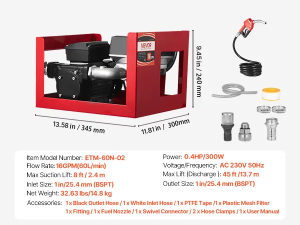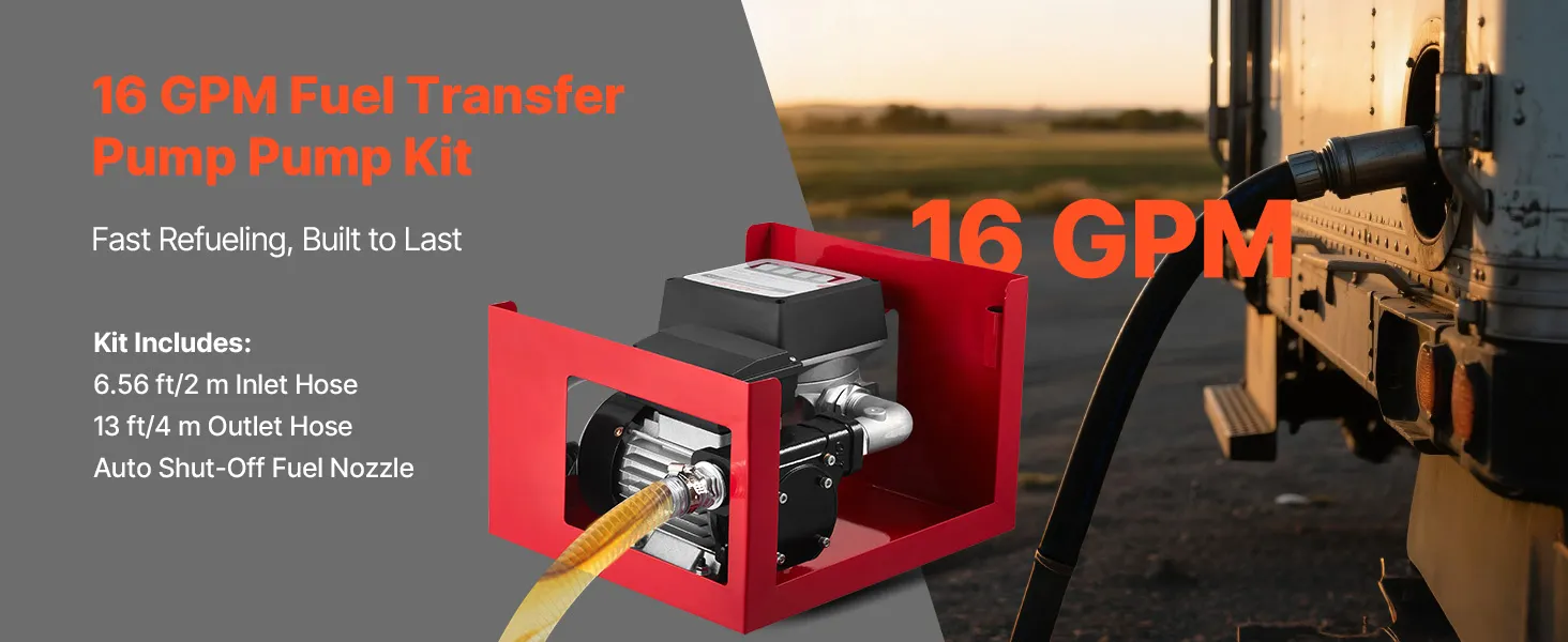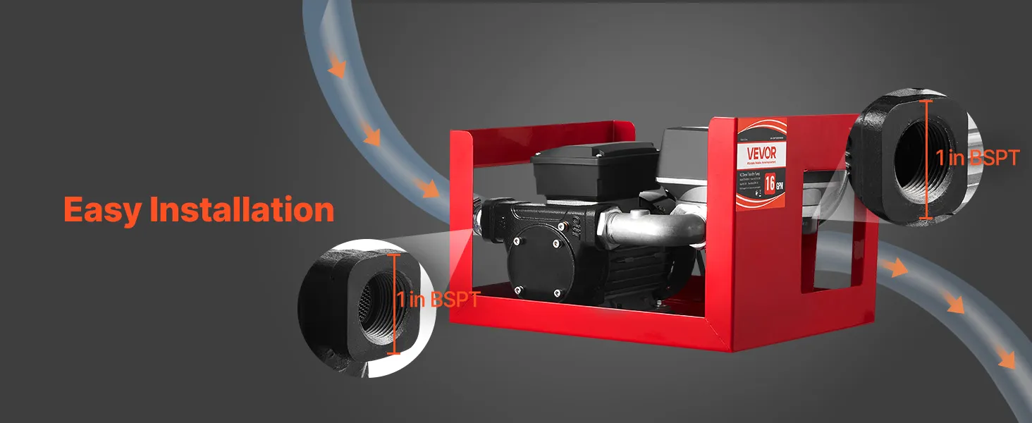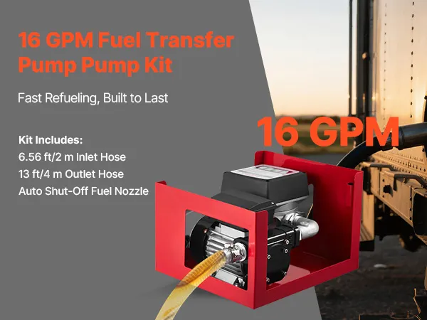 Szybki transfer paliwa z maksymalnym przepływem 60 l/min (16 GPM), maksymalną wysokością ssania 2,4 m (8 stóp) i maksymalną wysokością tłoczenia 13,7 m (45 stóp). Wyposażona w silnik z czystej miedzi, żeliwną głowicę pompy i zintegrowane zabezpieczenie przed przegrzaniem, pompa ta oferuje niezawodną wydajność i bezpieczną pracę z olejem napędowym, naftą i biodieslem.