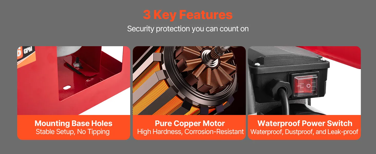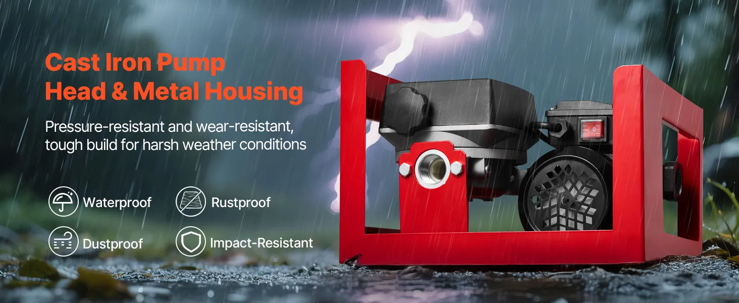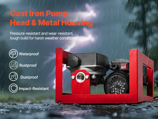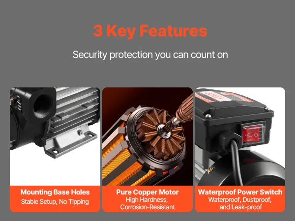 Solidna konstrukcja z żeliwa: Żeliwo zapewnia odporność na wysokie ciśnienie, zużycie i korozję. Ta pompa transferowa na olej napędowy 230 V z wodoodpornym wyłącznikiem zapobiega przedostawaniu się wody na zewnątrz i w wilgotnych warunkach.