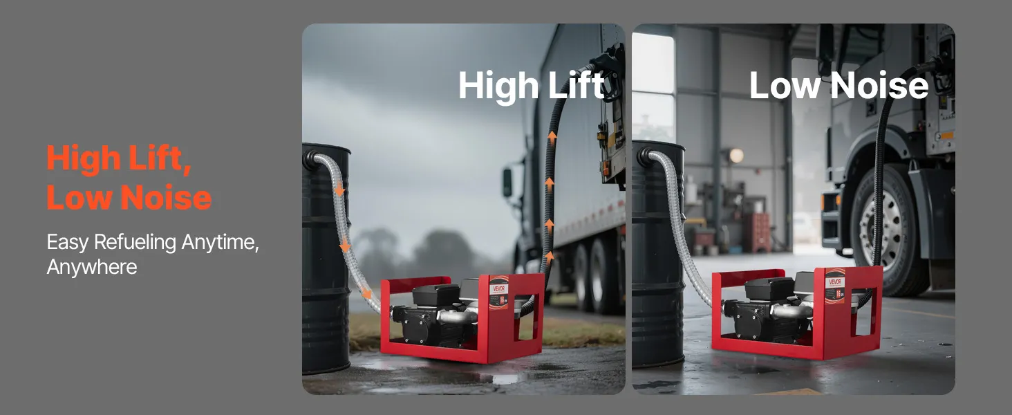 Dzięki imponującej maksymalnej wysokości podnoszenia wynoszącej 13,7 m (45 stóp) ta pompa do przesyłu paliwa diesla idealnie nadaje się do pracy w nocy lub w miejscach, w których hałas jest nieodpowiedni, gdyż umożliwia wydajne dostarczanie paliwa bez przerywania pracy.