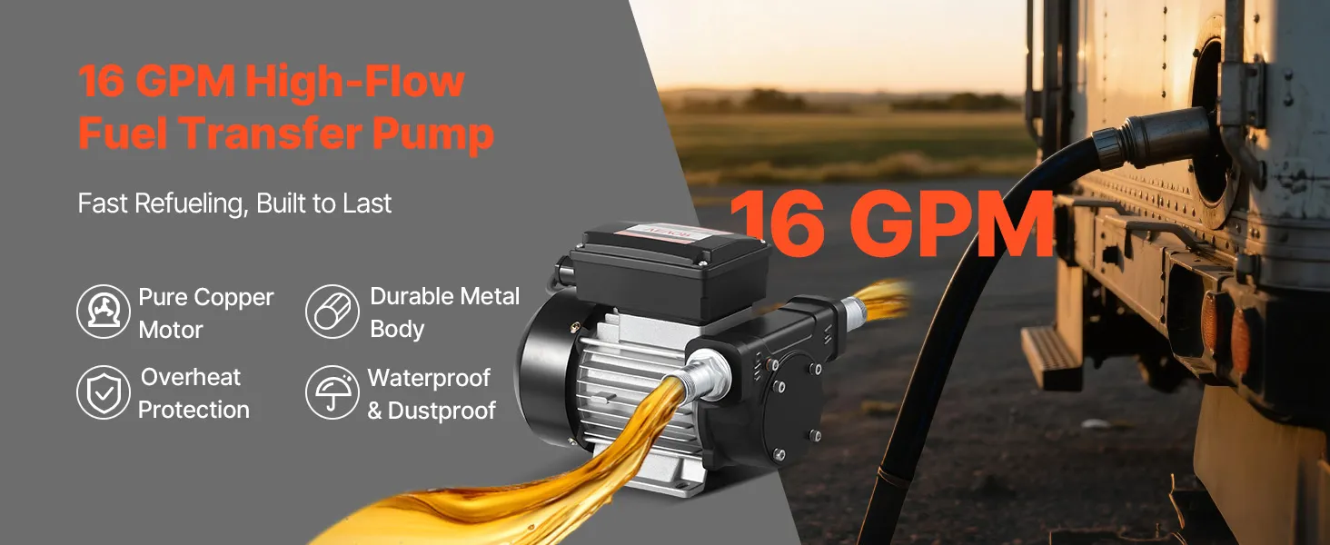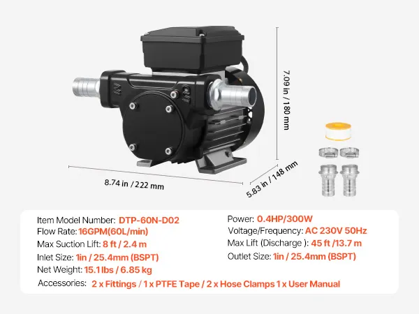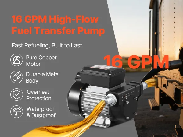 Szybki transfer paliwa z maksymalnym przepływem 60 l/min (16 GPM), maksymalną wysokością ssania 2,4 m (8 stóp) i maksymalną wysokością tłoczenia 13,7 m (45 stóp). Wyposażona w silnik z czystej miedzi, żeliwną głowicę pompy i zintegrowane zabezpieczenie przed przegrzaniem, pompa ta oferuje niezawodną wydajność i bezpieczną pracę z olejem napędowym, naftą i biodieslem.