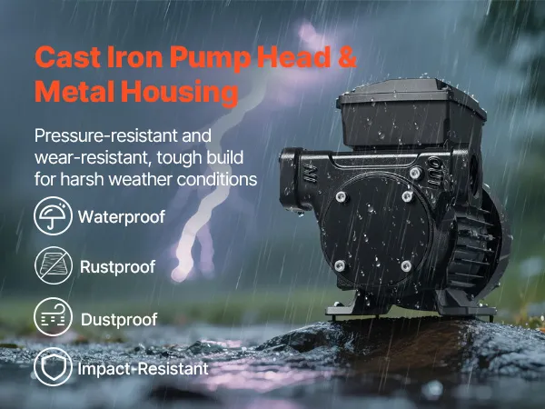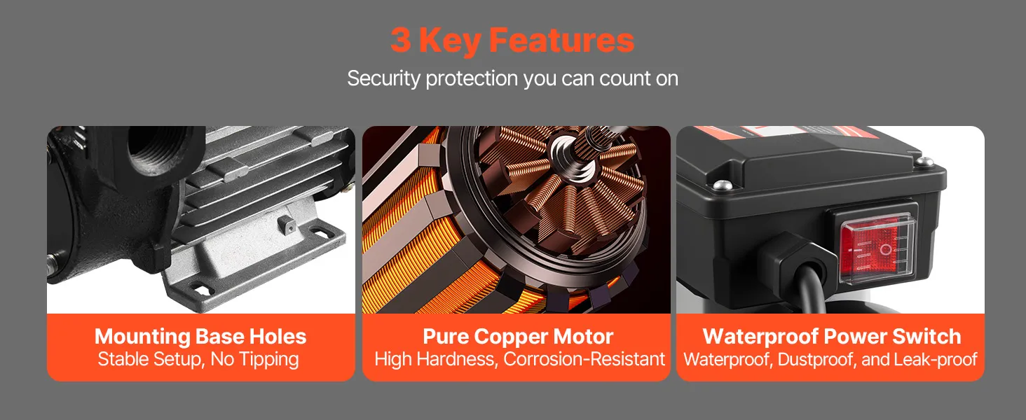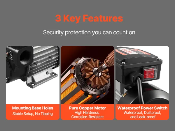 Solidna konstrukcja z żeliwa: Żeliwo zapewnia odporność na wysokie ciśnienie, zużycie i korozję. Ta pompa transferowa na olej napędowy 230 V z wodoodpornym wyłącznikiem zapobiega przedostawaniu się wody na zewnątrz i w wilgotnych warunkach.