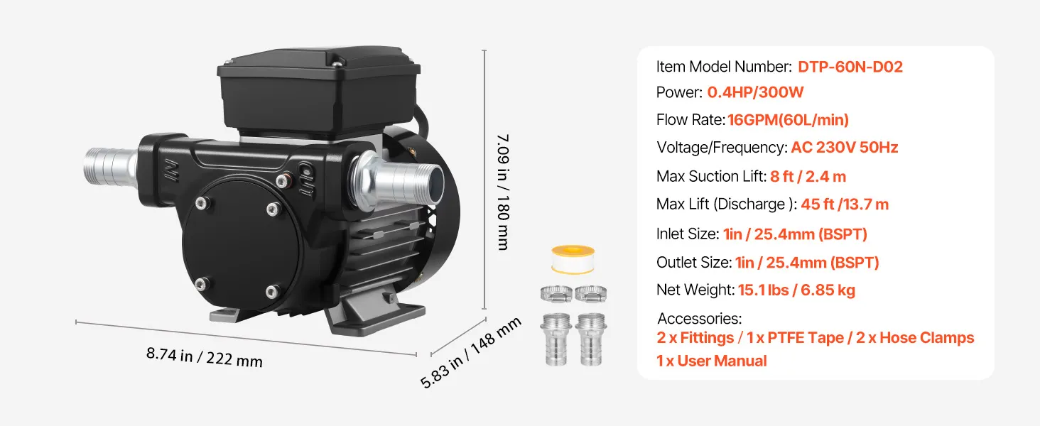 Pompa do przesyłu paliwa VEVOR, 230 V AC, elektryczna pompa do przesyłu oleju napędowego, 60 l/min, maksymalna wysokość ssania 2,4 m, maksymalna wysokość podnoszenia 13,7 m, do nafty, biodiesla, maszyn rolniczych
