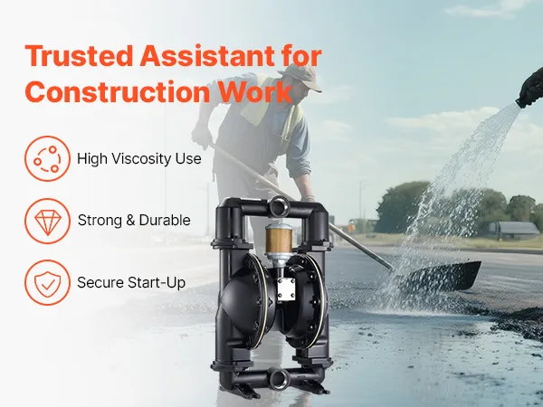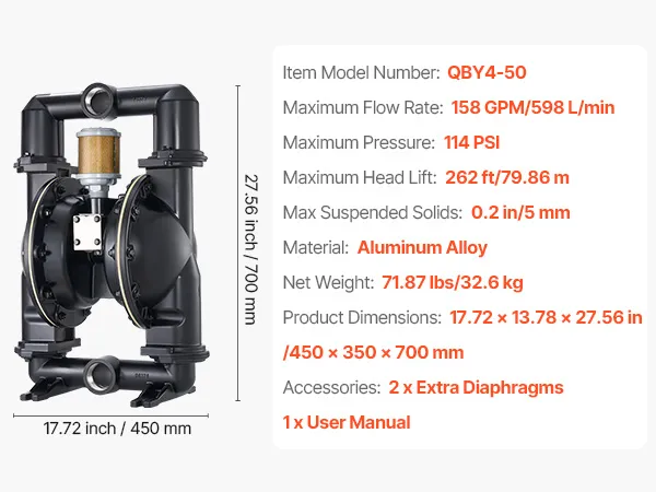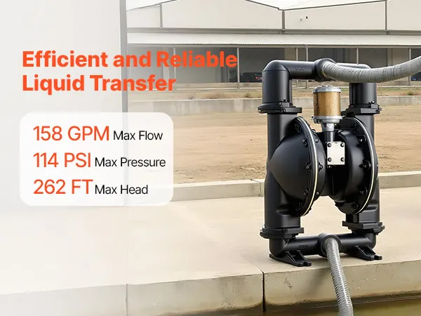 Wysokowydajna pompa pneumatyczna: oferuje maksymalny przepływ 158 GPM/598 l/min, maksymalne ciśnienie 114 PSI i maksymalną wysokość podnoszenia 262 stóp/79,86 m. Ta pompa membranowa szybko i wydajnie pompuje ciecze do zbiorników docelowych w ciągu kilku minut, bez obaw o ciśnienie.