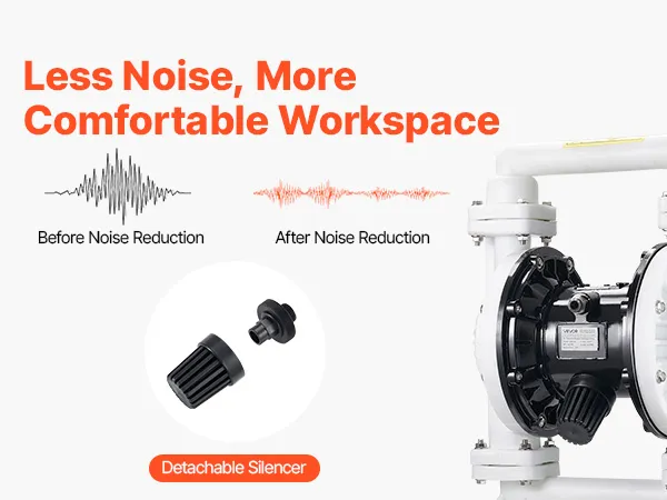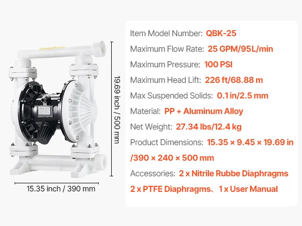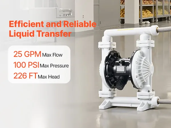 Wydajna pompa pneumatyczna: oferuje maksymalny przepływ 25 GPM/95 l/min, maksymalne ciśnienie 100 PSI i maksymalną wysokość podnoszenia 226 stóp/68,88 m. Ta pompa membranowa pneumatyczna szybko i wydajnie pompuje ciecze do zbiorników docelowych w ciągu kilku minut, bez obaw o ciśnienie.