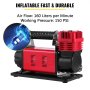 Sprężarka powietrza może szybko napompować opony samochodowe, gdy opona przecieka lub ciśnienie w oponach jest niewystarczające. W tej pompie zastosowano wysokiej jakości silnik miedziany, który działa szybko i stabilnie. Prędkość napełniania osiąga niesamowite 160 l/min. Nadaje się do samochodów, rowerów, motocykli, pojazdów kempingowych, SUV-ów, quadów i ciężarówek.