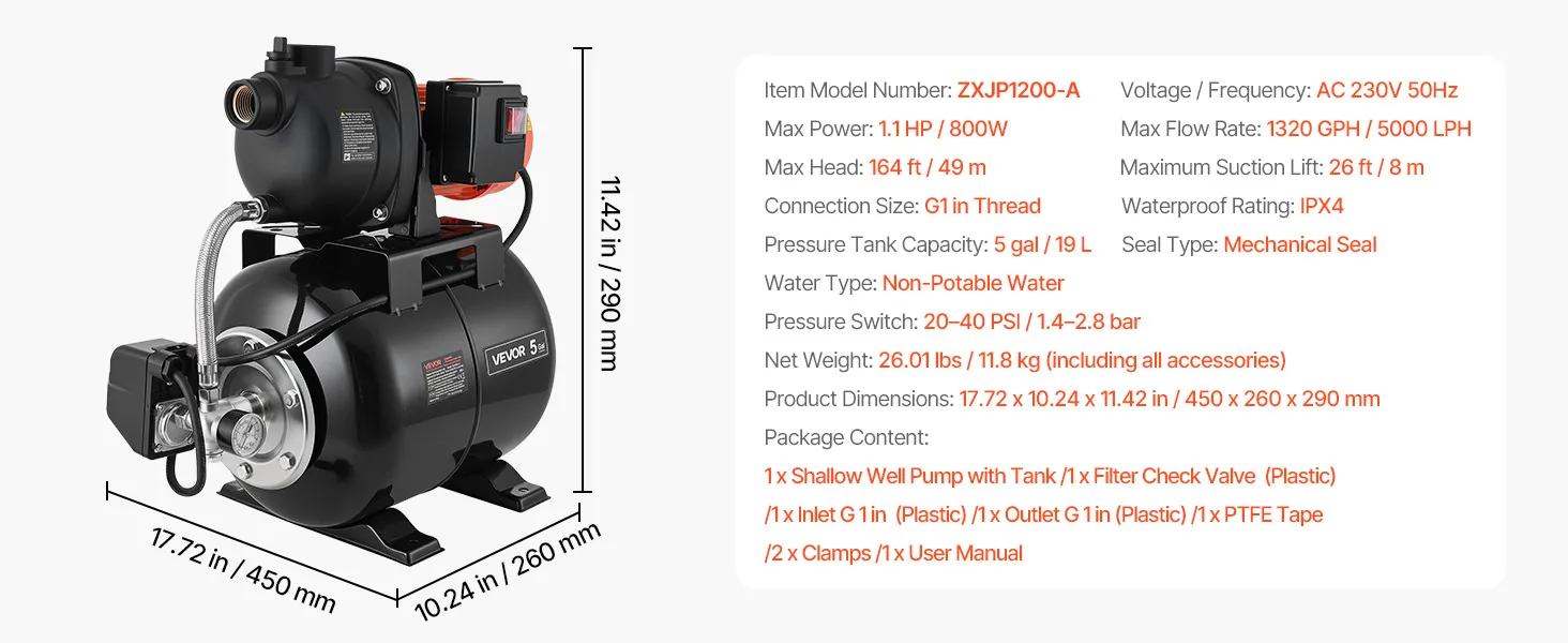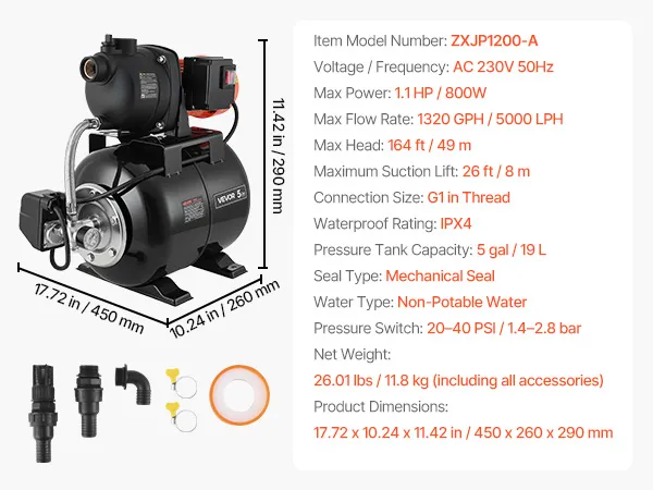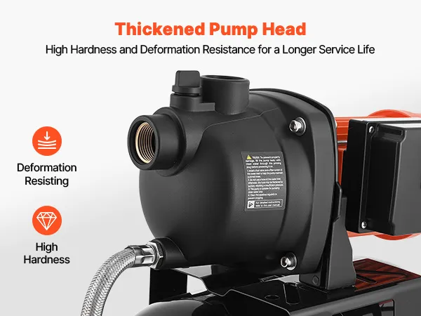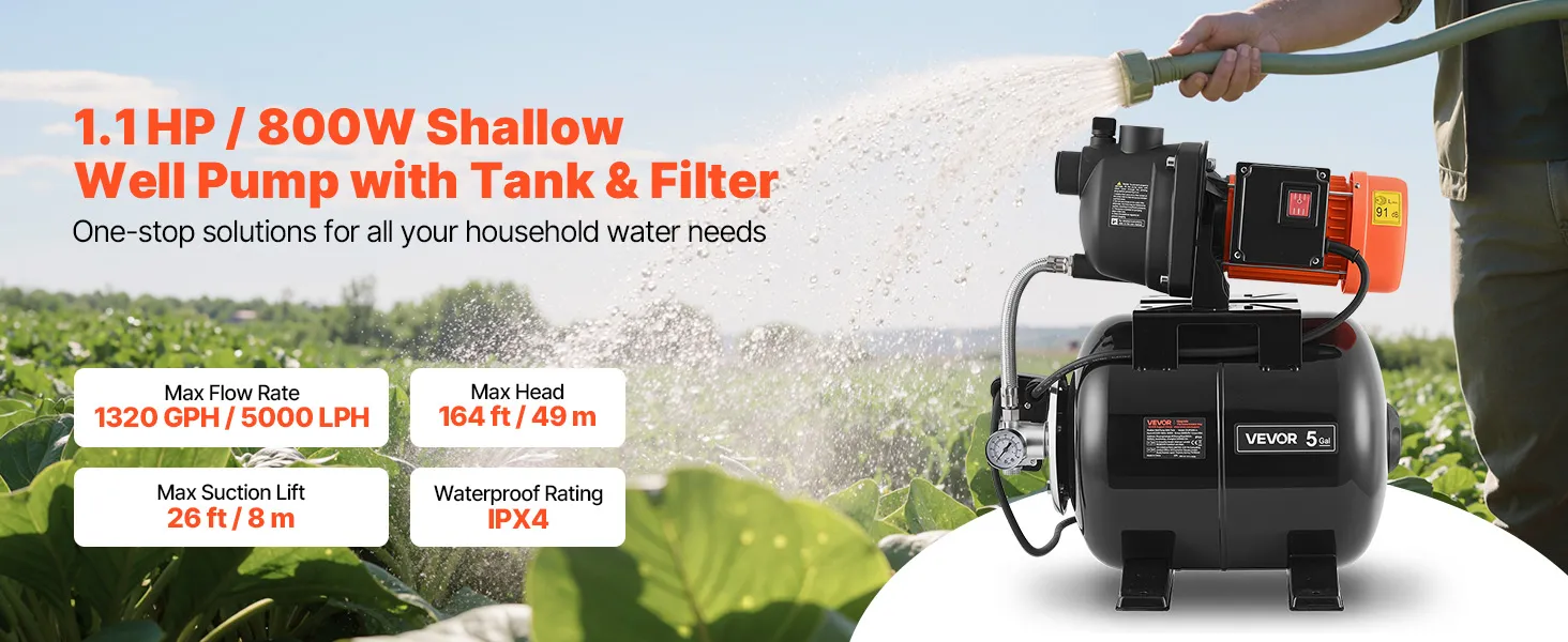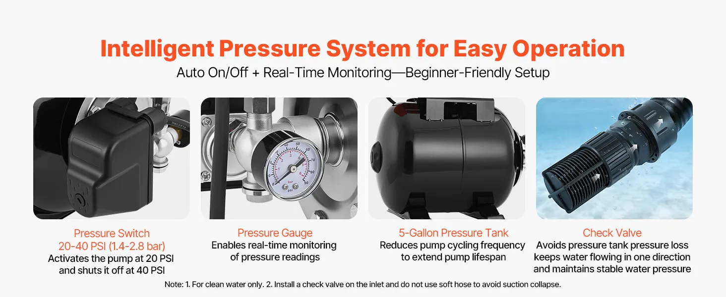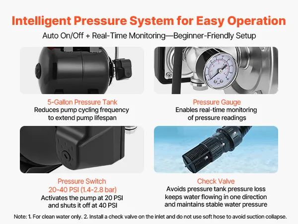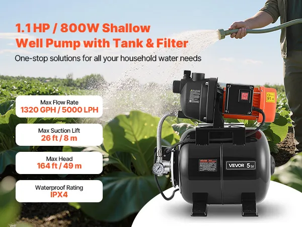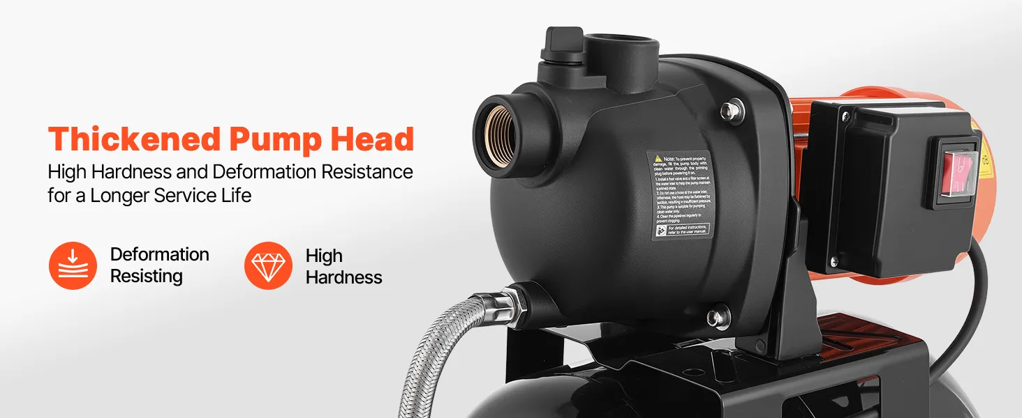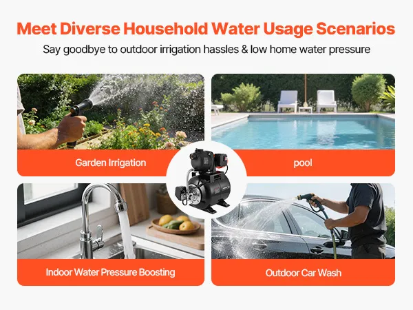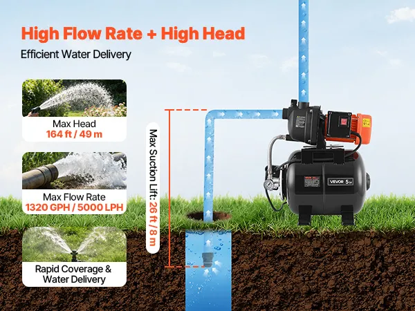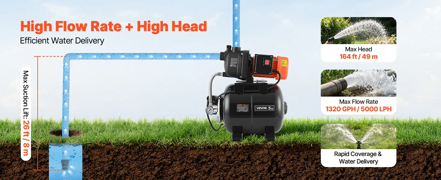Wydajna pompa: Ten domowy system zaopatrzenia w wodę dostarcza do 5000 litrów na godzinę i osiąga maksymalną wysokość podnoszenia 49 m (164 stóp). Z łatwością radzi sobie z nawadnianiem dużych ogrodów i trawników, zapewniając jednocześnie stałe ciśnienie do użytku domowego.