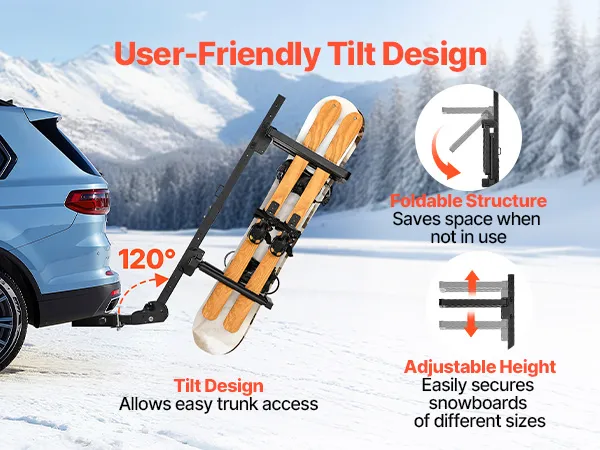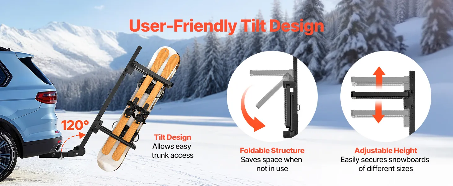 Odchylana konstrukcja: Nasz bagażnik na snowboard montowany na haku holowniczym odchyla się o 120°, umożliwiając otwarcie bagażnika bez konieczności demontażu bagażnika. Nie nadaje się do pojazdów o długości powyżej 18 stóp (ok. 5,5 m), w tym przyczep, kamperów i przyczep kempingowych. Przed zakupem prosimy o sprawdzenie wymiarów pojazdu.