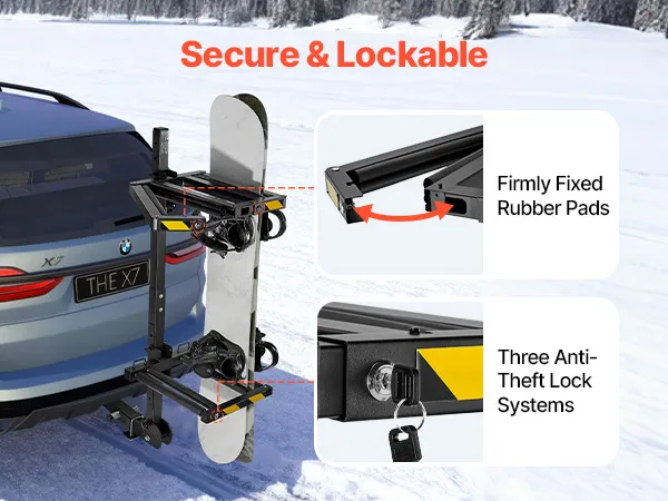 Dzięki zintegrowanemu zamknięciu antykradzieżowemu, ten bagażnik na narty i snowboard chroni przed kradzieżą i przypadkowym otwarciem na zewnątrz, szybko zabezpieczając narty. Miękkie, grube gumowe podkładki mocno trzymają narty na miejscu, nie rysując ani nie uszkadzając sprzętu.