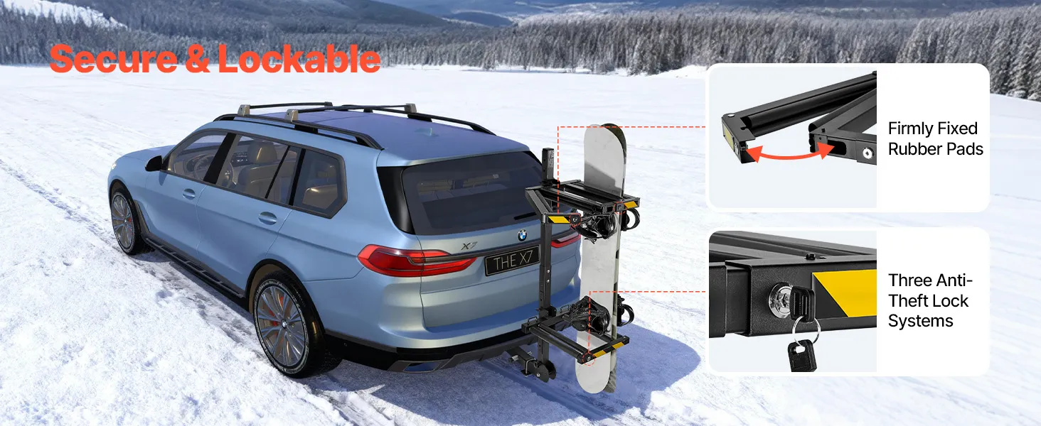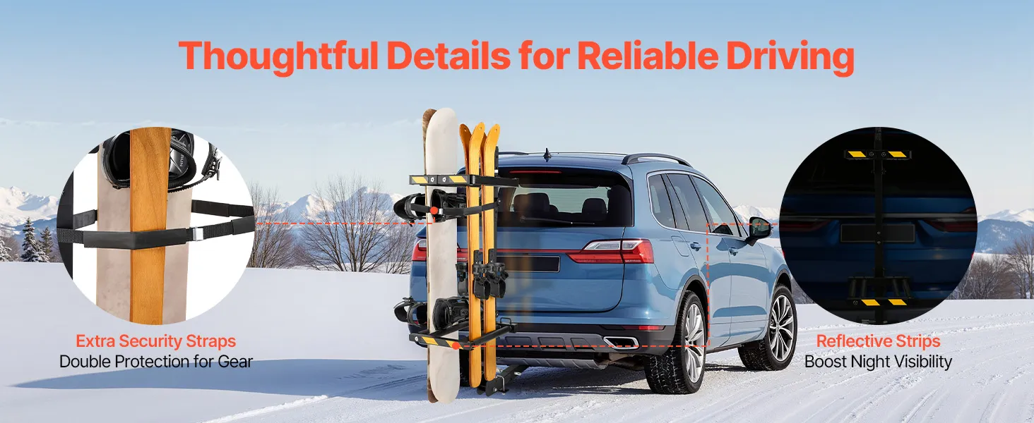 Przyjazna dla użytkownika konstrukcja: Ten zamykany bagażnik na narty i snowboard, wykonany z wytrzymałej stali Q235 i wyściełany grubą gumą, zapewnia bezpieczeństwo sprzętu i chroni go przed zarysowaniami. Odblaskowe paski zwiększają widoczność, a regulowane, składane półki oszczędzają miejsce.