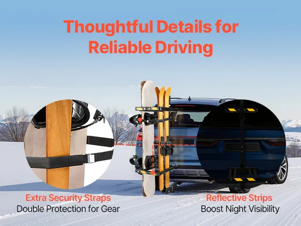 Nasz zamykany bagażnik na narty i snowboard wyposażony jest w paski odblaskowe zapewniające lepszą widoczność w ciemności, a dodatkowe paski bezpieczeństwa zapewniają stabilność i bezpieczeństwo nart podczas transportu. Te przemyślane detale pozwolą Ci cieszyć się zimowymi aktywnościami na świeżym powietrzu z większym spokojem ducha.