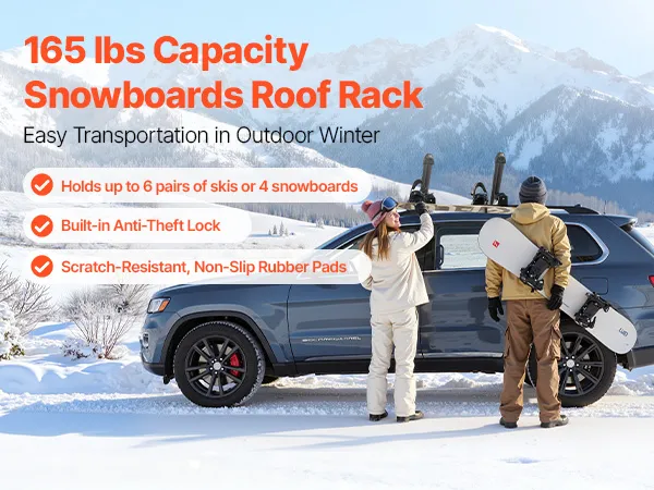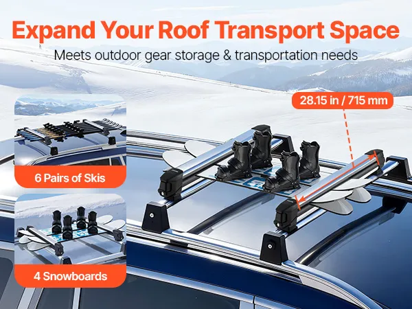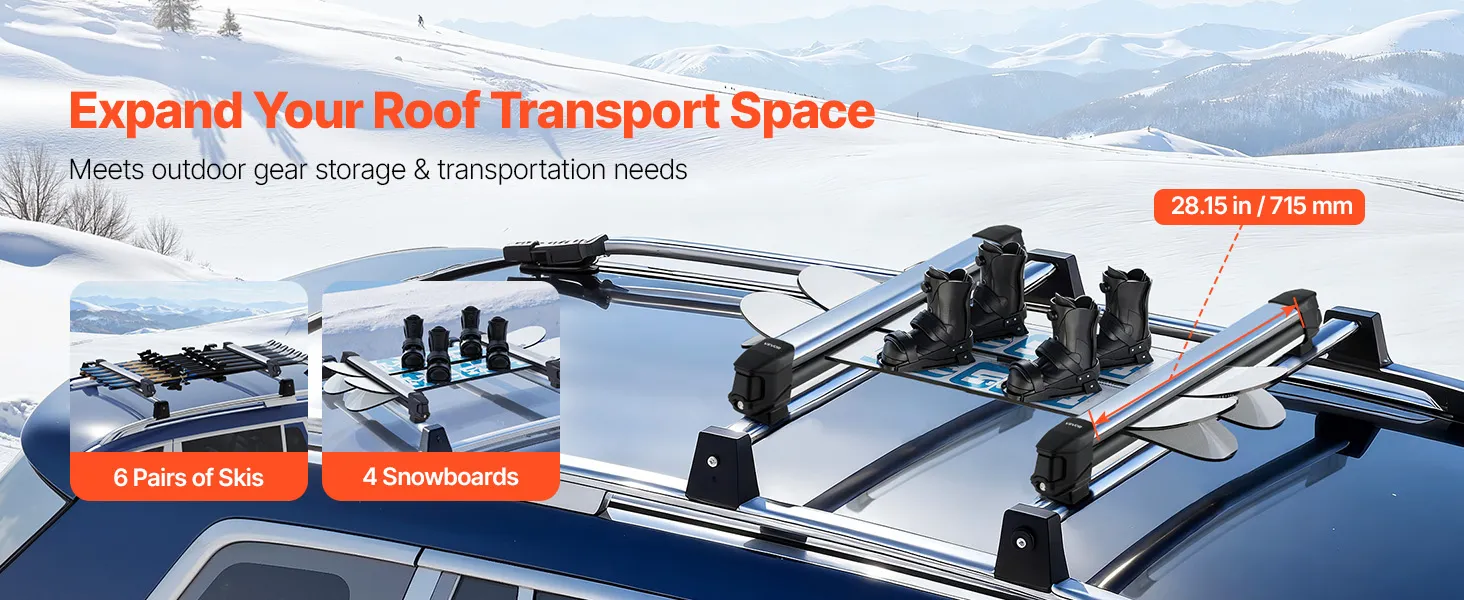 Duża pojemność: Ten bagażnik dachowy na snowboard pomieści do sześciu par nart lub cztery duże deski snowboardowe o maksymalnej ładowności 75 kg (165 funtów). Pomieści również wędki i deskorolki, oferując wszechstronne możliwości przechowywania i transportu.