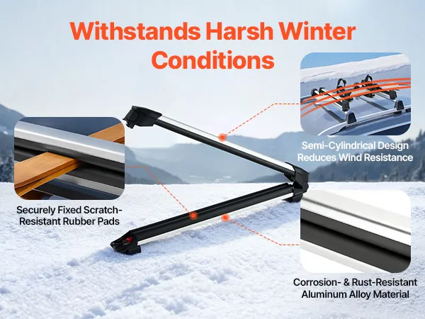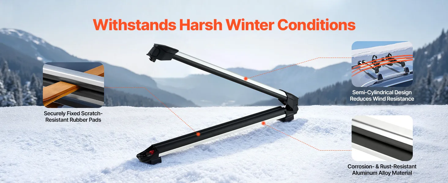 Materiał odporny na zimno: Aluminiowa rama bagażnika snowboardowego zapewnia doskonałą odporność na zimno, korozję, rdzę i pęknięcia, nawet w ekstremalnych warunkach zimowych. Półcylindryczna konstrukcja zmniejsza opór powietrza i hałas podczas transportu.