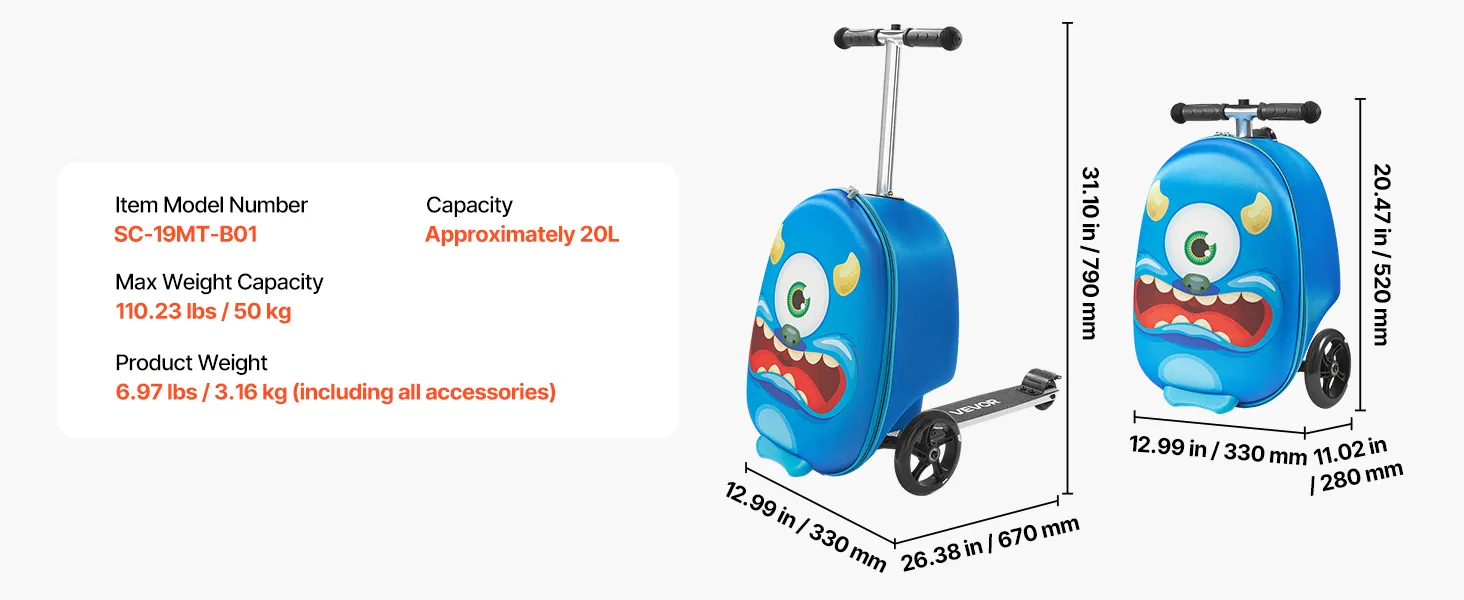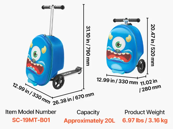 Walizka na hulajnogę VEVOR, pojemność 20 l, walizka podróżna z kołami Flash PU, antypoślizgowy uchwyt TPR, maksymalna nośność 50 kg, bagaż podręczny dla dzieci, dla dzieci w wieku 5 lat i starszych, kolor niebieski