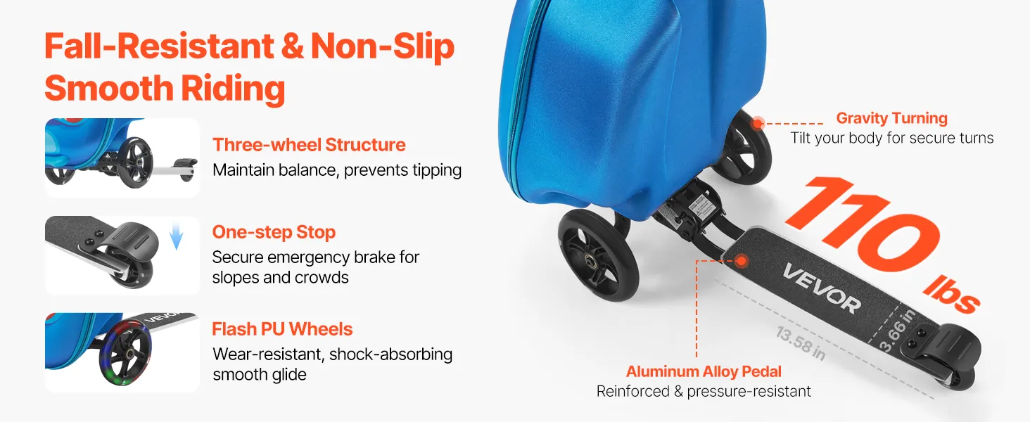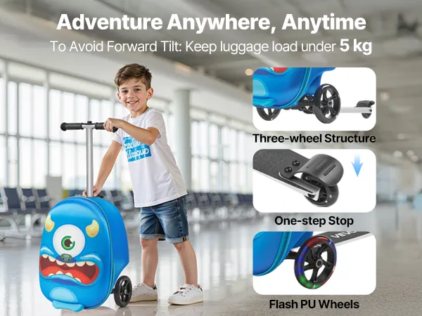 Bezpieczna jazda: Dzięki podwójnym przednim kołom i jednokierunkowemu kołu tylnemu ta walizka na hulajnogę dla dzieci stoi stabilnie i się nie przewróci. Antypoślizgowa rączka TPR i hamulec nożny zapewniają stabilną kontrolę, nawet w zatłoczonych miejscach lub na zboczach.