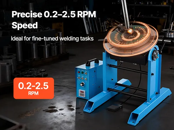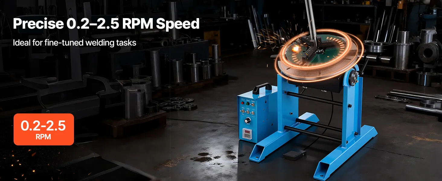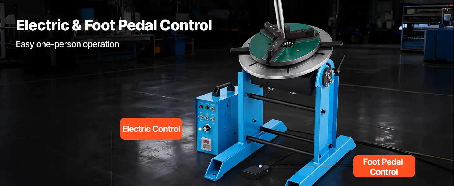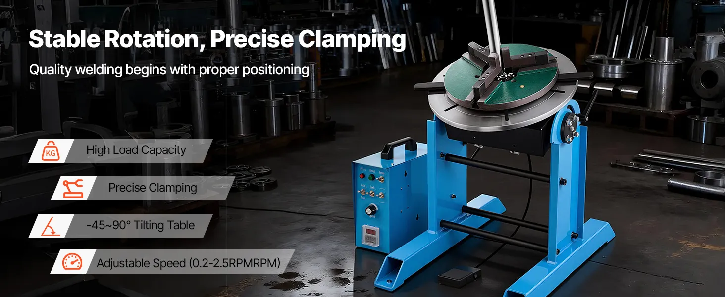 Obrotowy stół spawalniczy VEVOR 300 kg, pozycjoner spawalniczy 200 W, kąt nachylenia od -45° do 90°, regulacja prędkości 0,2–2,5 obr./min, elektryczny i pedał nożny, do cięcia, szlifowania i prac montażowych