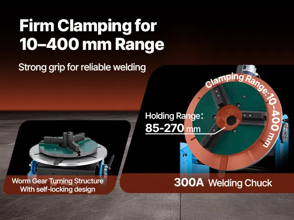 Uchwyt spawalniczy o szerokim zakresie mocowania: Uchwyt spawalniczy 300A oferuje zakres mocowania od 0,4 do 15,8 cala (od 10,16 do 401,32 mm) i zakres trzymania od 3,4 do 10,6 cala (od 86,36 do 269,24 mm), co pozwala naszemu obrotowemu stołowi spawalniczemu na bezpieczne trzymanie szerokiej gamy elementów obrabianych.