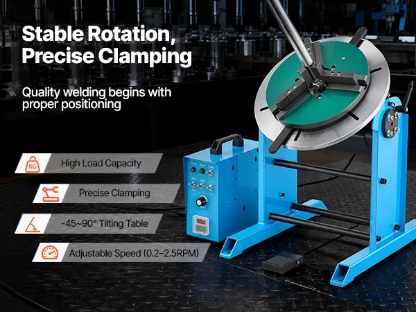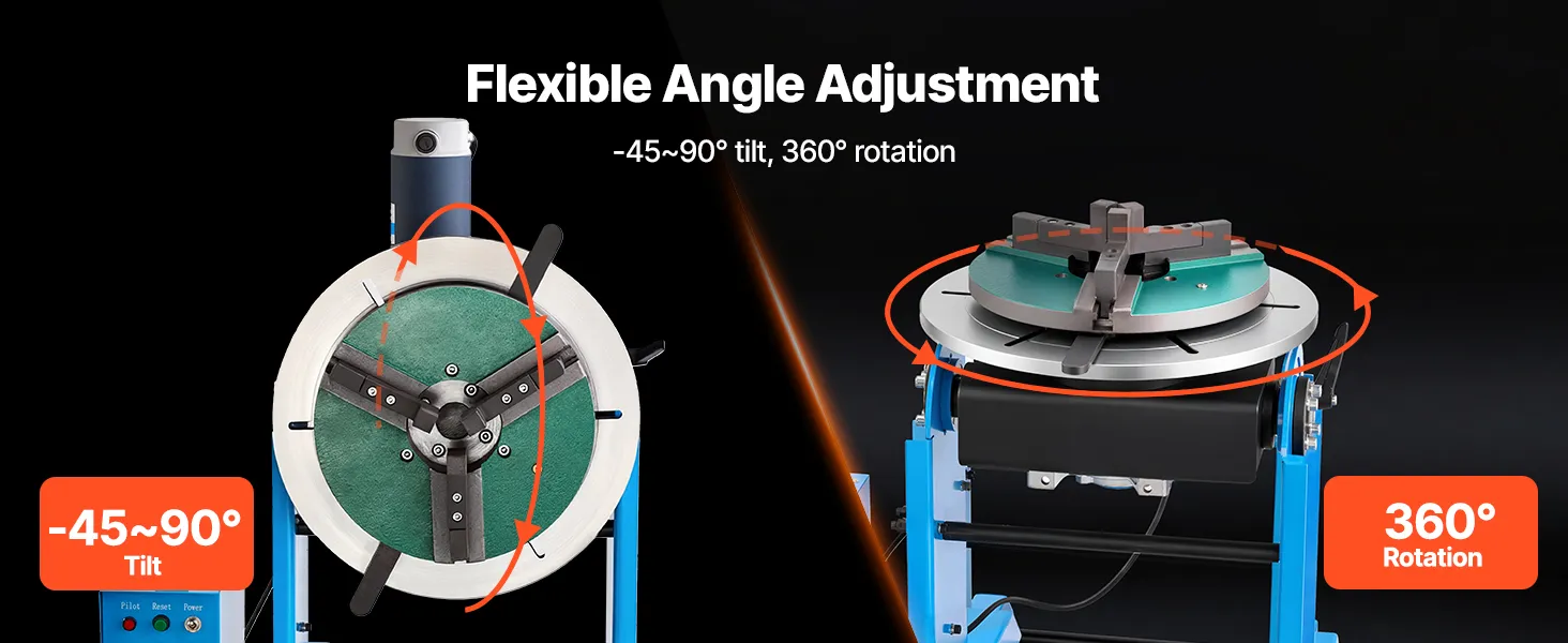 Zakres pochylenia od -45° do 90° oraz płynny obrót o 360° zapewniają precyzyjne ustawienie. Nasz obrotowy stół spawalniczy posiada solidną ramę ze stali węglowej i szeroki zakres mocowania, co umożliwia wykonywanie różnorodnych zadań spawalniczych. Pedał nożny zmniejsza obciążenie operatora i zwiększa wydajność zarówno dla profesjonalistów, jak i hobbystów.