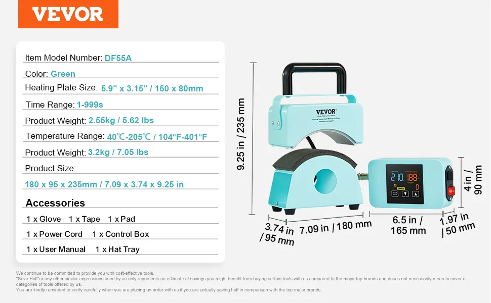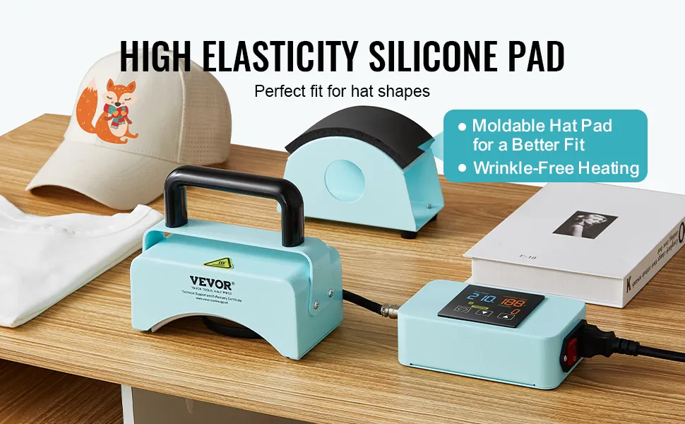 Prasa do czapek VEVOR, miniaturowa prasa do czapek z wbudowanym panelem sterowania, prasa do czapek z zakrzywioną płytą grzewczą o wymiarach 15 x 8 cm, podstawą zabezpieczającą i rękawicą, automatycznym wyłączaniem, kolor niebieski
