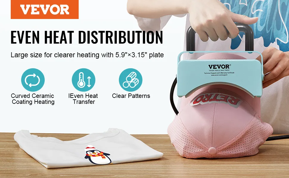 Precyzyjny transfer ciepła: Ta wielofunkcyjna, przenośna prasa do kapeluszy ożywi Twoje projekty DIY. Dzięki zakrzywionemu, pokrytemu ceramiką elementowi grzewczemu o wymiarach 150 x 80 mm (5,9 x 3,15 cala), dopasowuje się do kształtu kapeluszy, zapewniając równomierne rozprowadzanie ciepła i wyraźne, żywe transfery, które poszerzają Twoje możliwości twórcze.