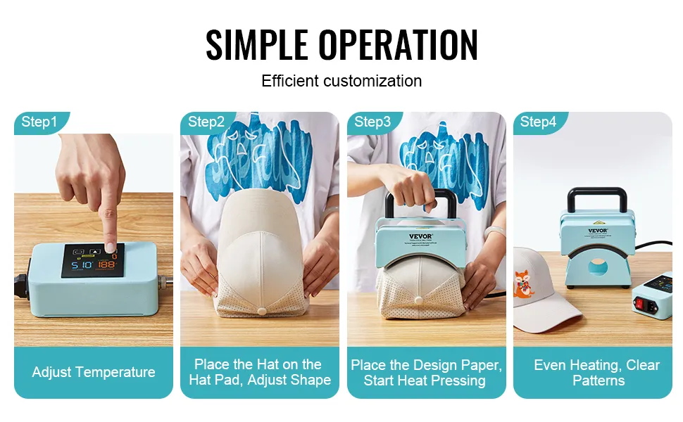 Z łatwością twórz spersonalizowane czapki. Nasza prasa do czapek wyposażona jest w zakrzywiony, pokryty ceramiką element grzejny, który dopasowuje się do kształtu czapki, zapewniając równomierne przenoszenie ciepła i wyraźny wzór.