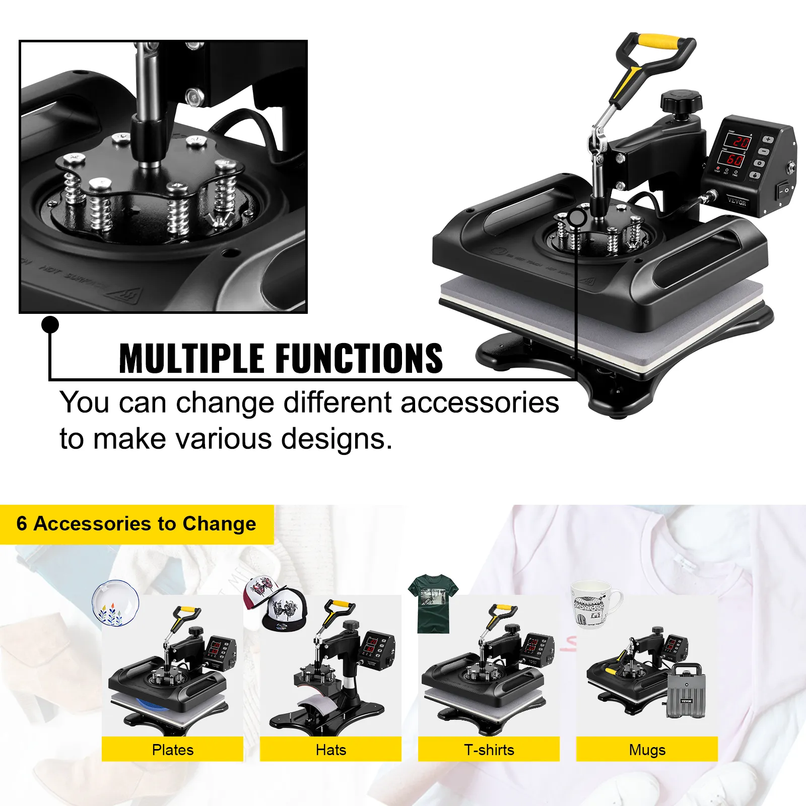 Ta maszyna do drukowania na koszulkach ma różne wyposażenie, w tym prasę rolkową, prasę do czapek/kapturków, prasę do kubków, prasę do aluminiowych garnków, dwie prasy płytowe, które mogą przenosić wzory na koszulki, czapki, kubki, talerze i inne płaskie powierzchnie.