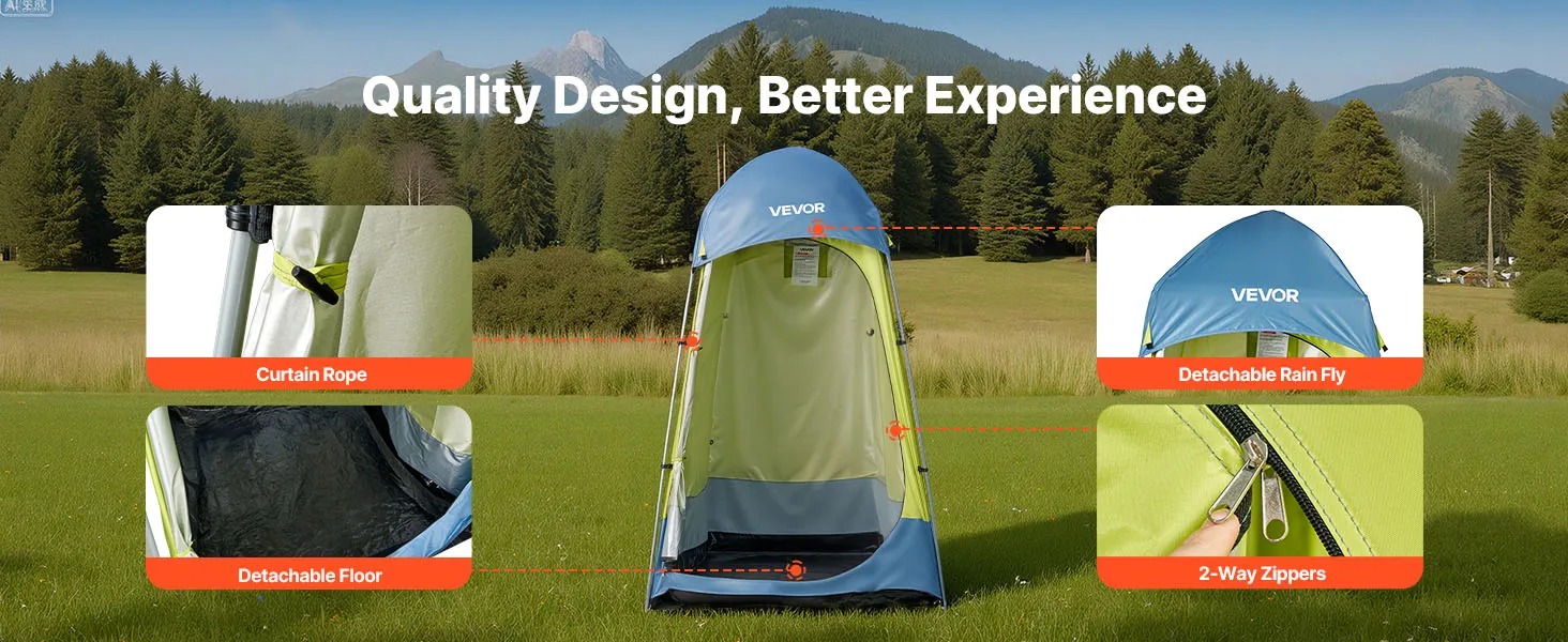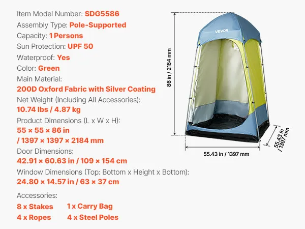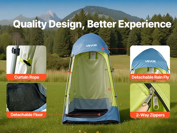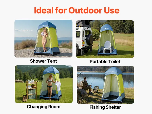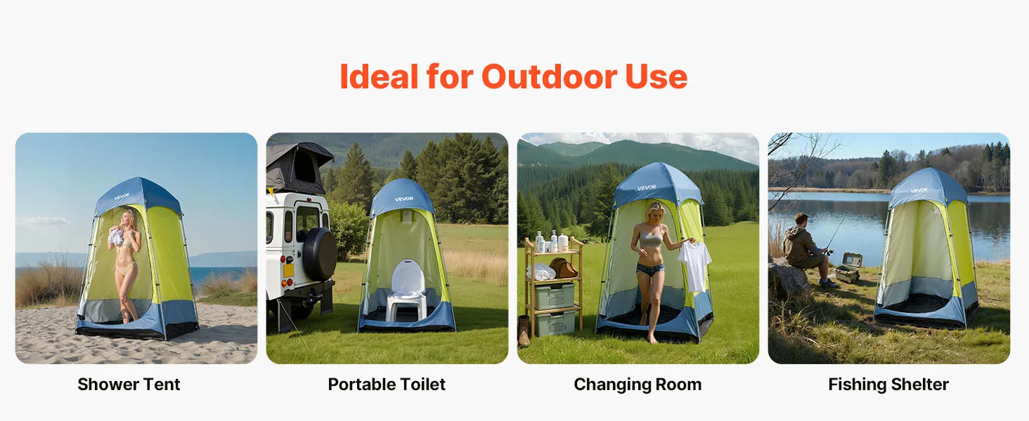 Wielofunkcyjny namiot: Ten namiot o wymiarach 1397 x 1397 x 2184 mm (55 x 55 x 86 cali) zapewniający prywatność oferuje dużo miejsca na prysznic. Zapewnia wentylację, gdy jest używany jako przenośna toaleta, i służy jako prywatna strefa do szybkich pryszniców, przerw na toaletę lub przebrania się.