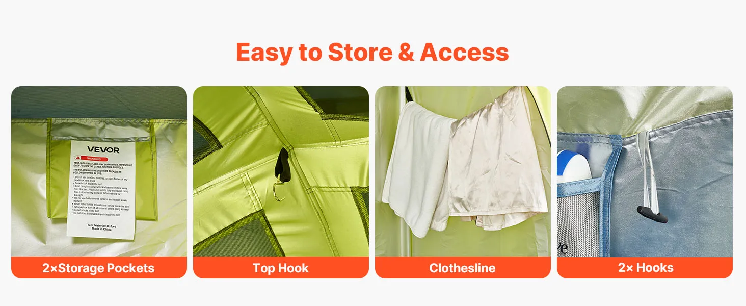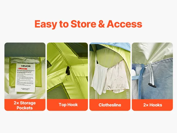 Nasz namiot toaletowy wyposażony jest w liczne kieszenie, linkę do wieszania ubrań i haczyki, dzięki czemu możesz wygodnie przechowywać ręczniki, ubrania, telefony komórkowe i inne przedmioty. Te przemyślane detale zapewniają większy komfort i przyjemność kąpieli pod prysznicem.