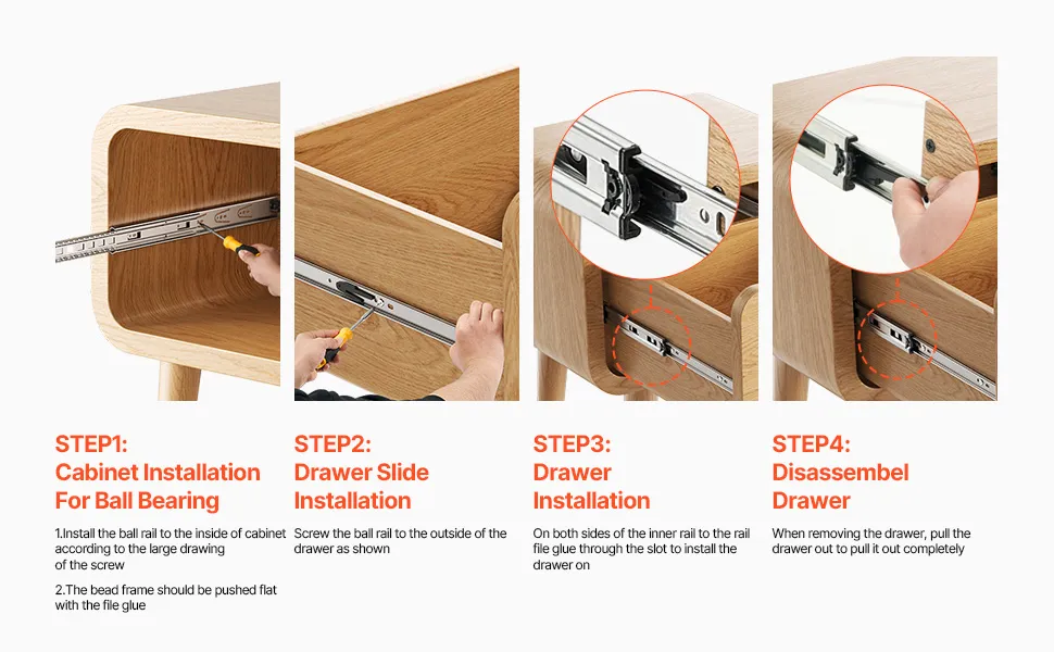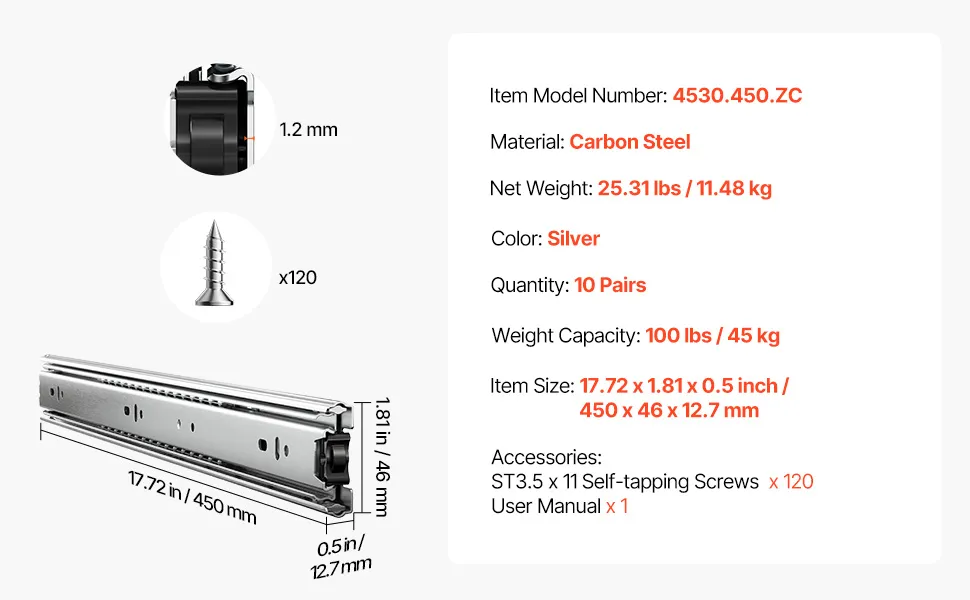 Prowadnice do szuflad VEVOR, 45 cm, 10 par, wysuwane prowadnice do szuflad z łożyskami kulkowymi, udźwig 45 kg, wytrzymałe prowadnice do szuflad montowane z boku, do samodzielnego montażu