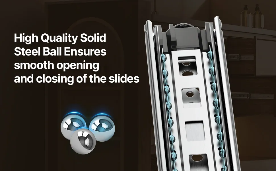 Cicha praca: Szuflady te wyposażone są w nylonową podkładkę antykolizyjną na końcu, która redukuje hałas podczas otwierania i zamykania. Posiadają także wysokiej jakości sprężyny i stalowe łożyska kulkowe, które zapewniają płynną, bezproblemową pracę z funkcją cichego, miękkiego zamykania.