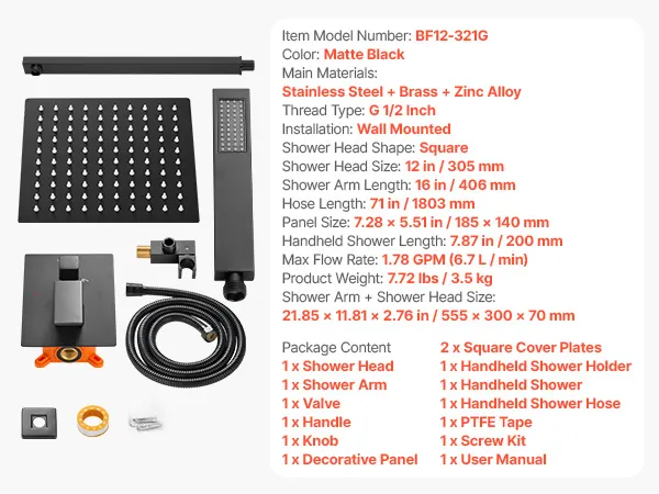 Bateria natryskowa VEVOR z deszczownicą do łazienki, z kwadratową głowicą deszczową o średnicy 305 mm i słuchawką prysznicową, bateria łazienkowa ścienna z zaworem mosiężnym i zestawem wykończeniowym, matowa czerń