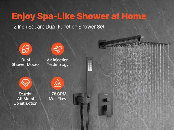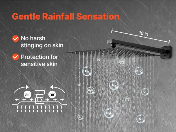 Prysznic z wysokim ciśnieniem: Nasz dwufunkcyjny system prysznicowy oferuje luksusowe doznania dzięki technologii wtrysku powietrza, zapewniającej wysokie ciśnienie nawet przy niskim poziomie wody. Oszczędzaj wodę dzięki przepływowi 1,78 GPM (6,7 l/min) i ciesz się relaksującym prysznicem niczym w spa.