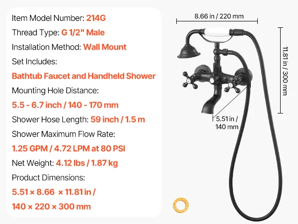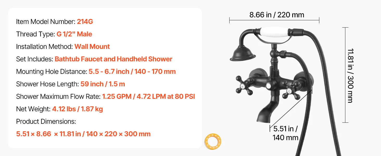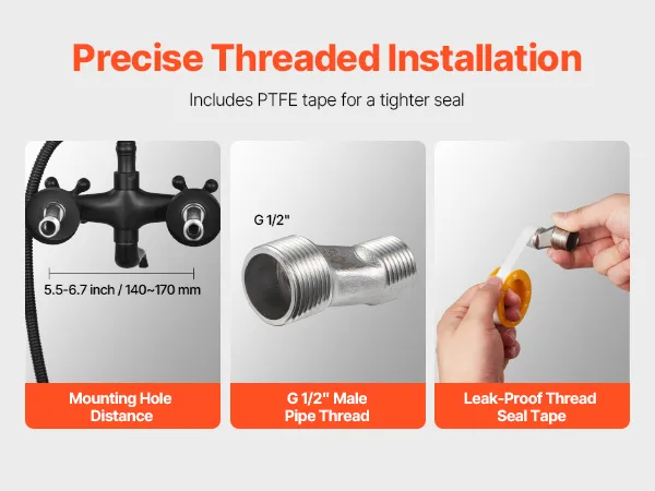 Łatwy montaż: Tę baterię wannową z prysznicem ręcznym można zamontować na ścianie lub w wannie. Posiada gwint zewnętrzny G 1/2" i regulowane ramiona obrotowe o rozstawie otworów 5,5-6,7 cala (140-170 mm). Uszczelka zapewnia lepszą szczelność i zapobiega przeciekom.